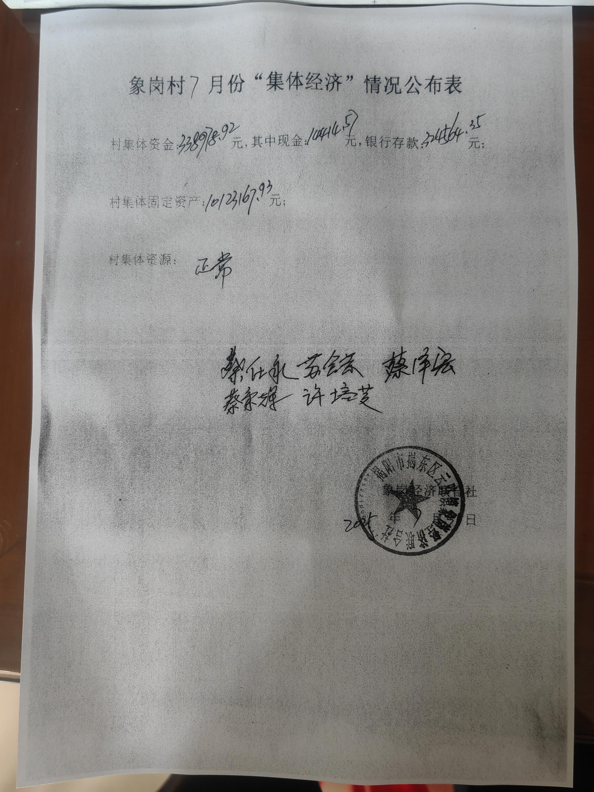 象岗村7月份集体经济情况公开表