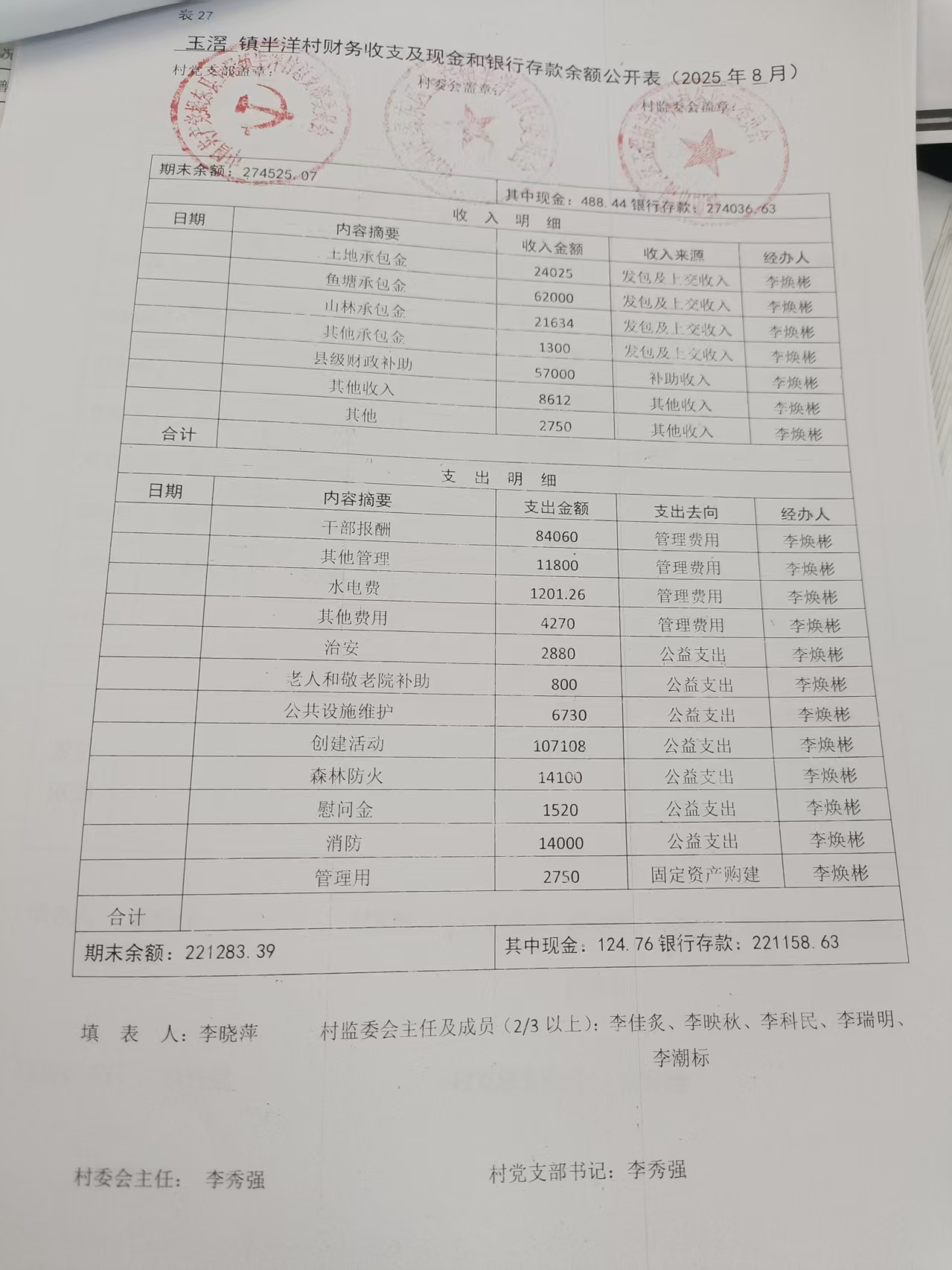 2025年8月玉滘镇半洋村财务收支及现金和银行存款余额公开表