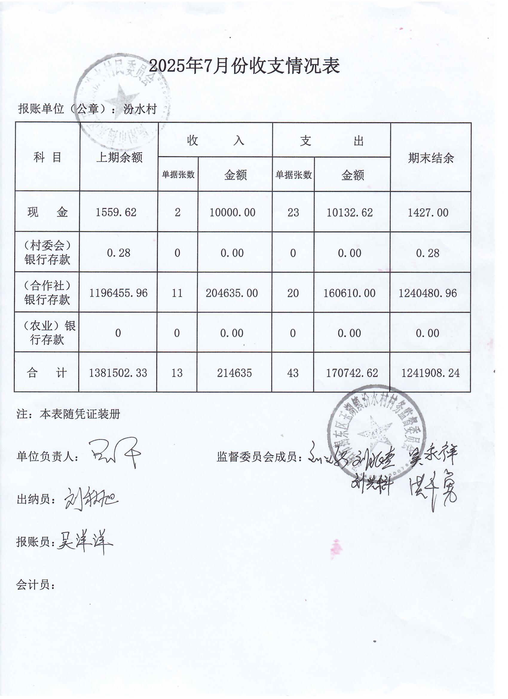 汾水村2025年7月三资管理情况