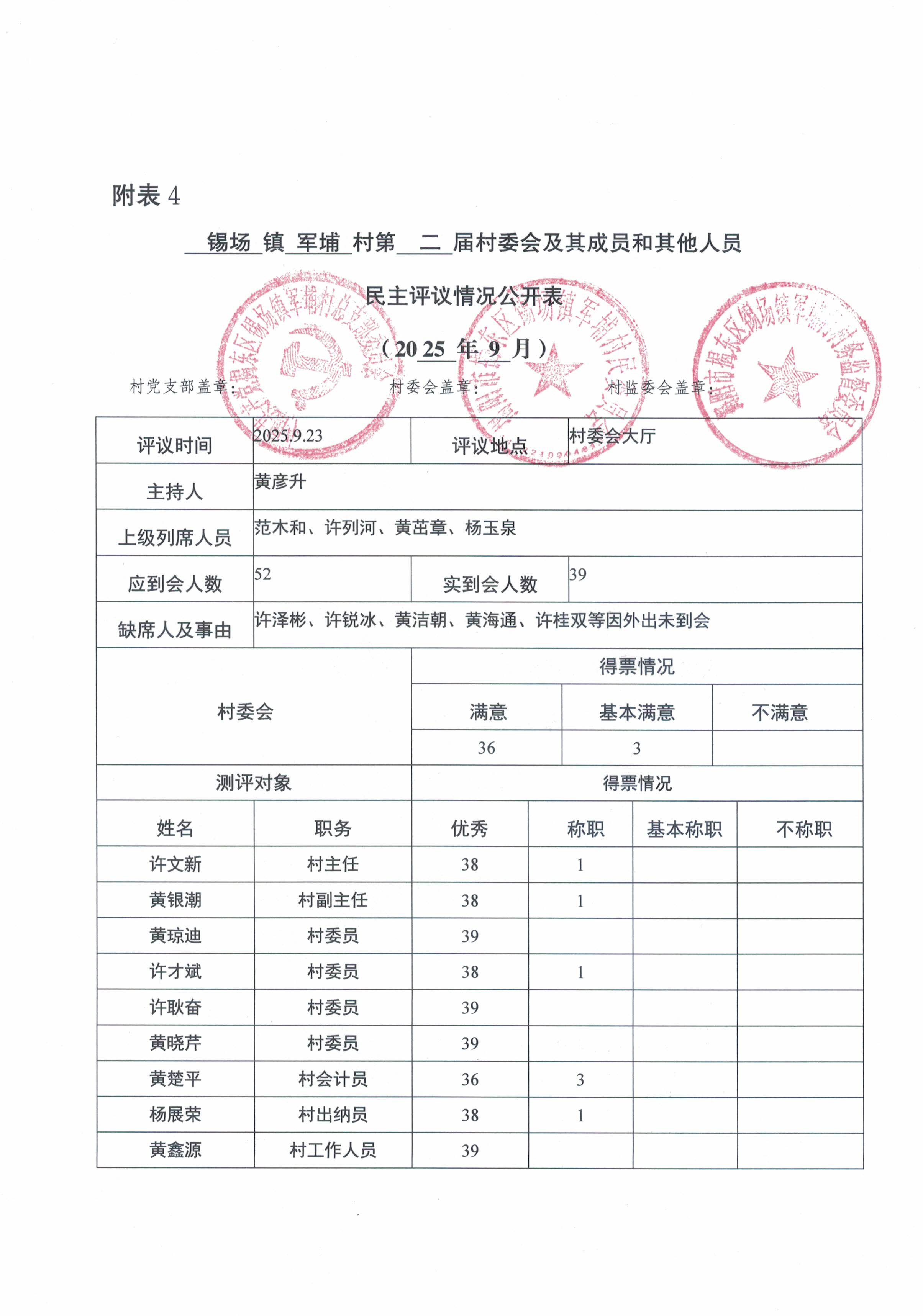 2025年9月 村务监督委员会成员民主评议情况
