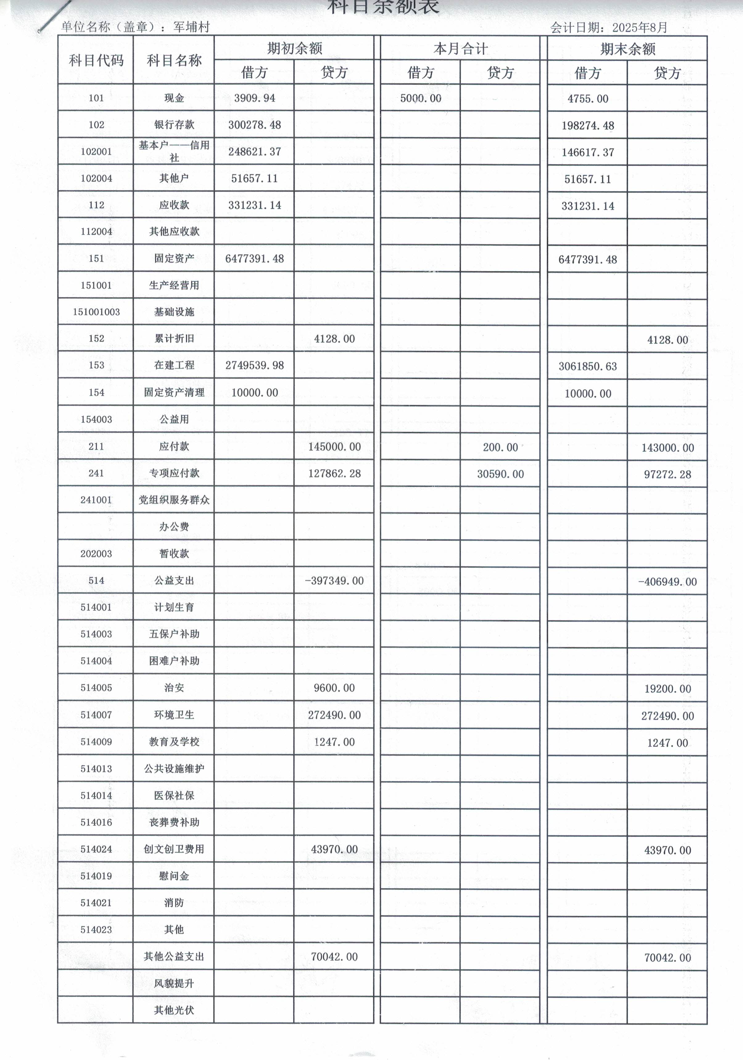 8月28日 付军埔村横二路路面及寨前池改造工程款 312316.65元