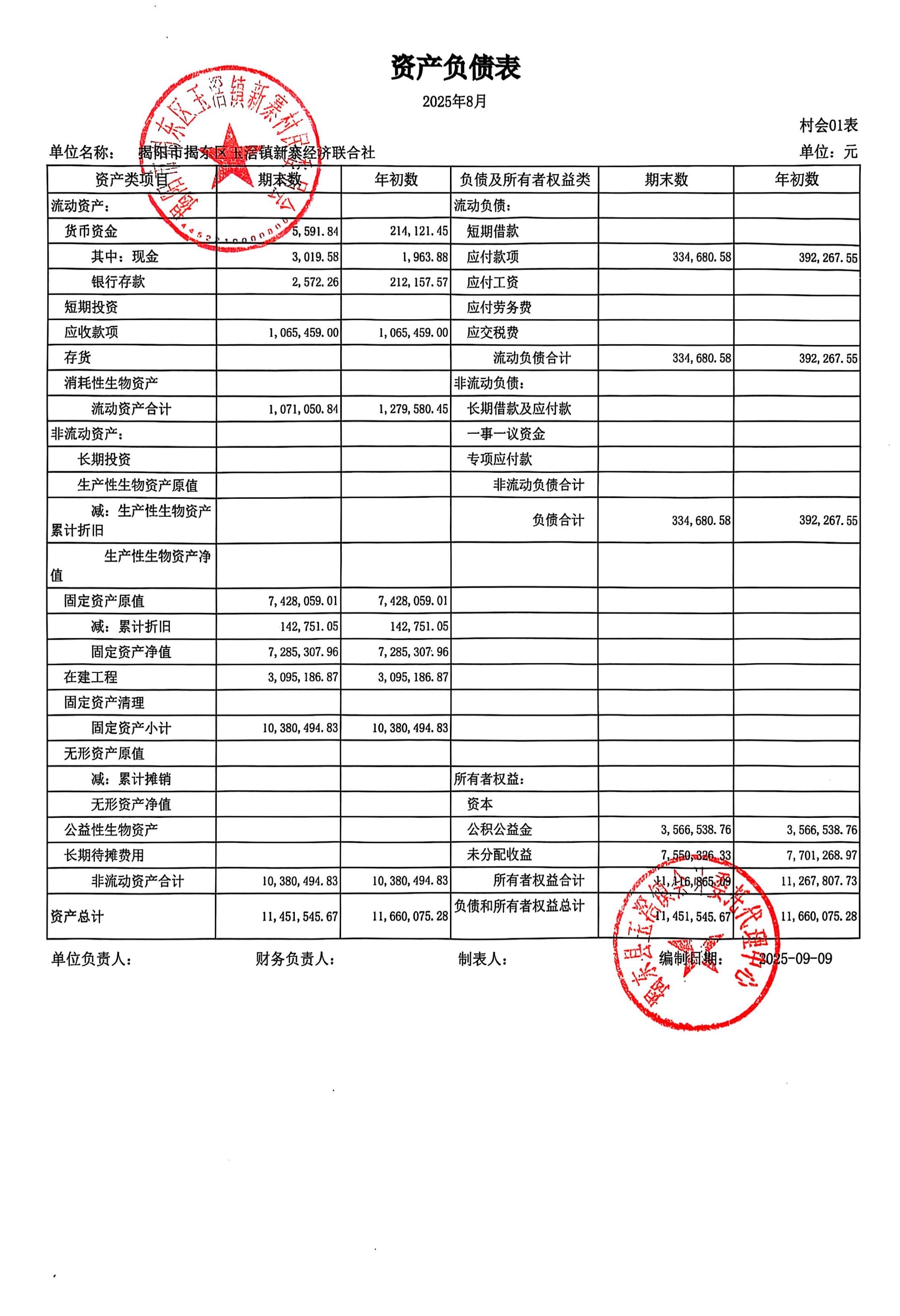 2025年8月新寨村三资情况