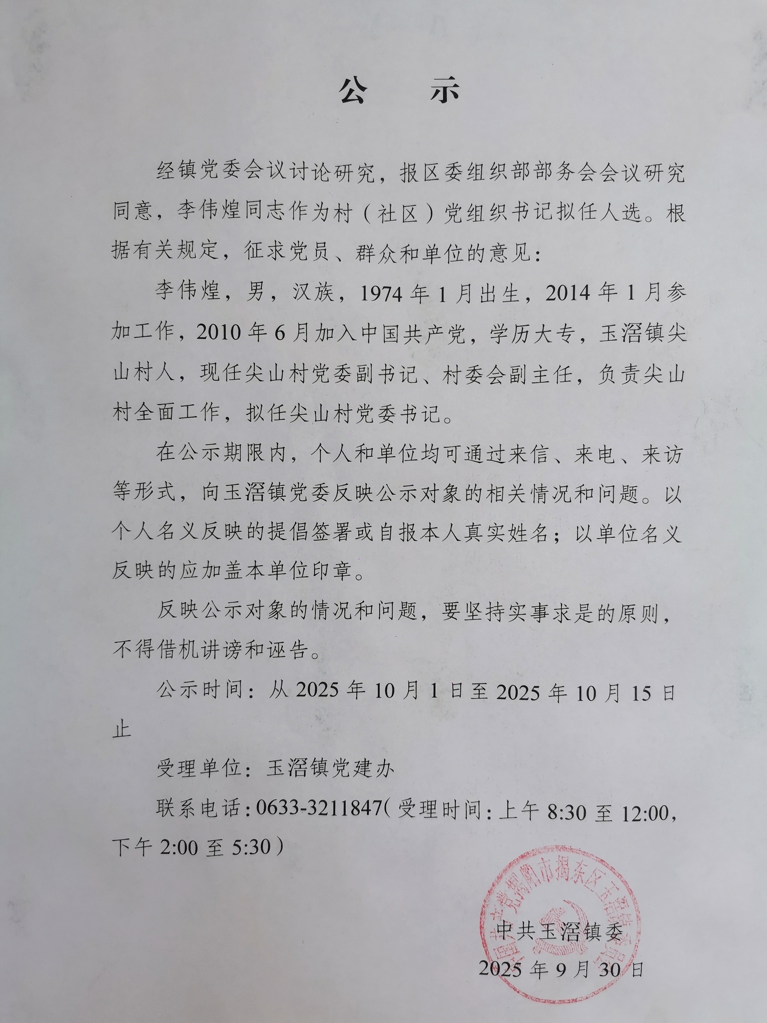 关于李伟煌同志拟任尖山村党委书记公示