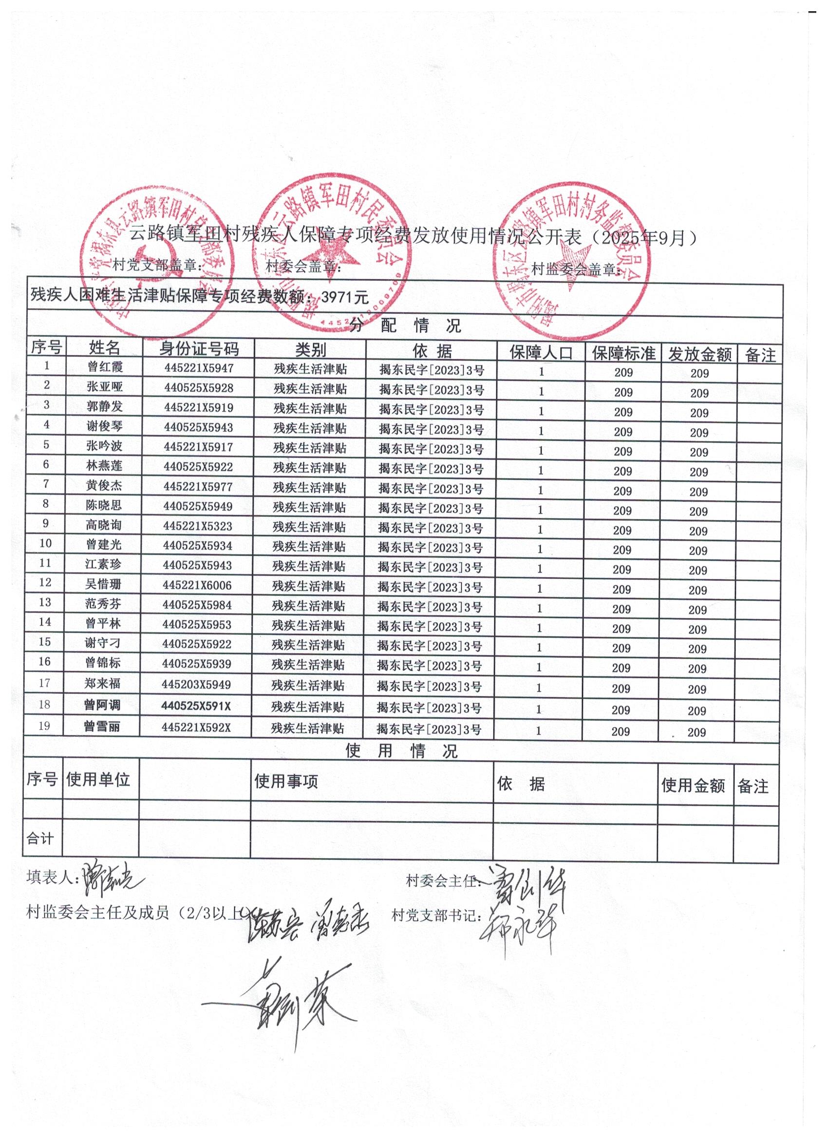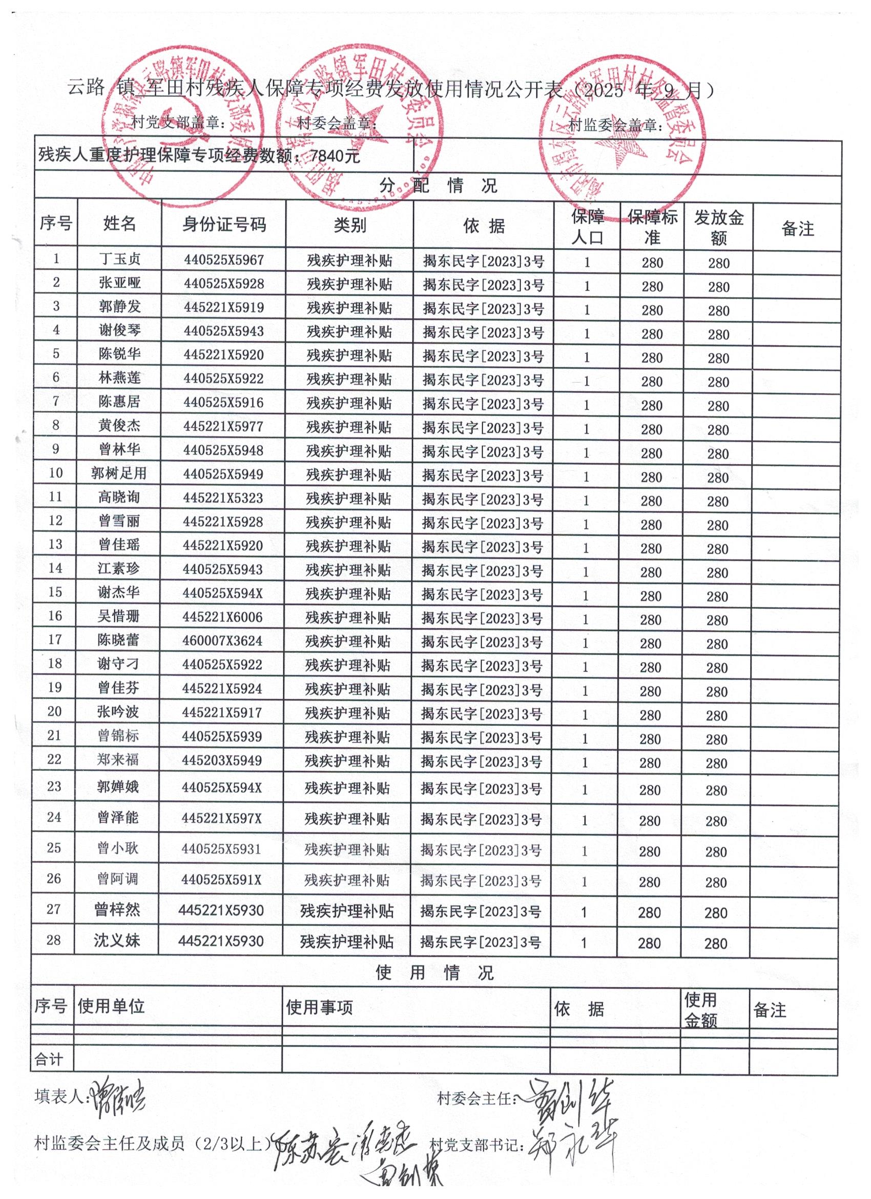 2025年9月残疾人保障专项经费发放使用情况公开表