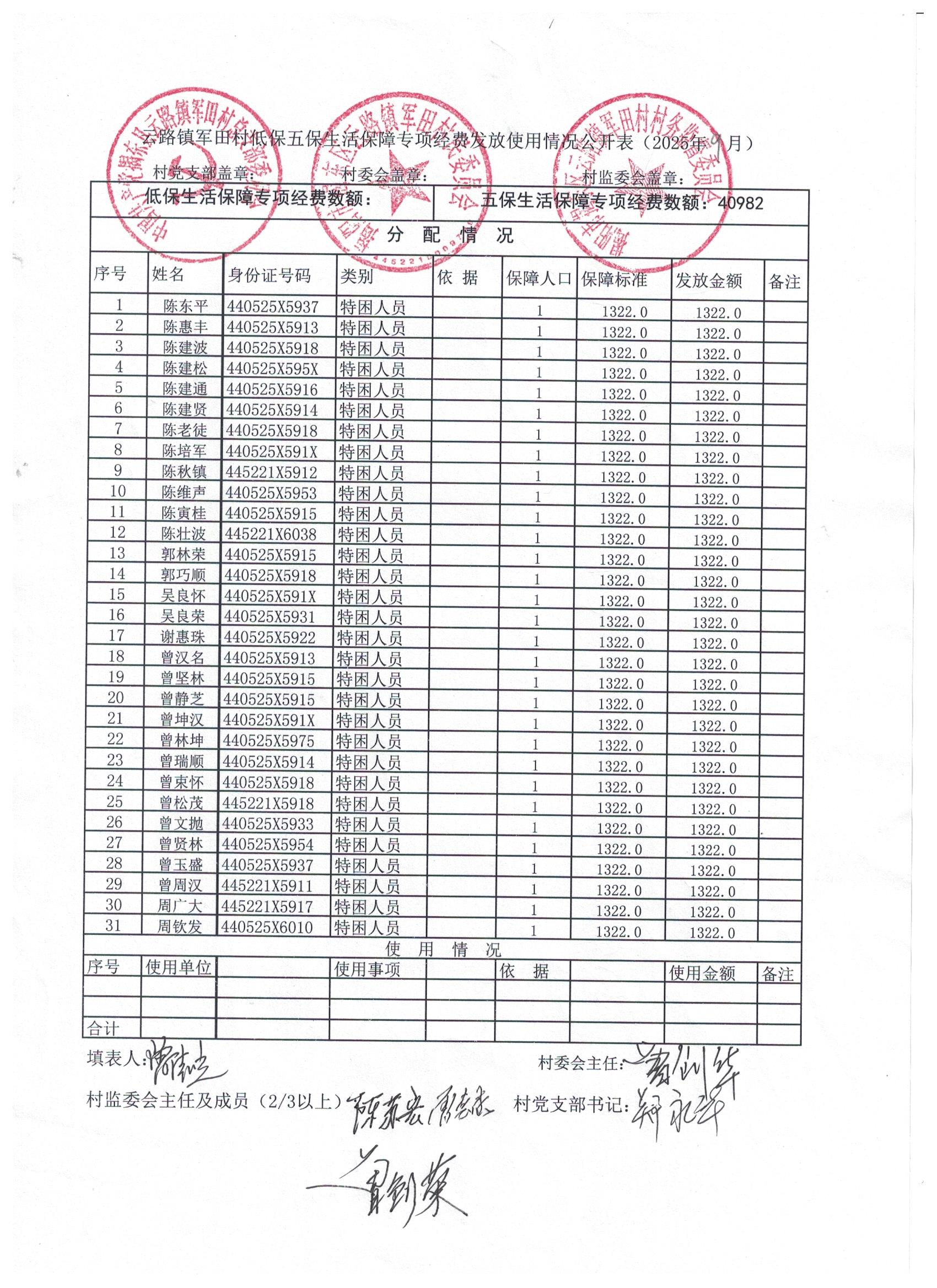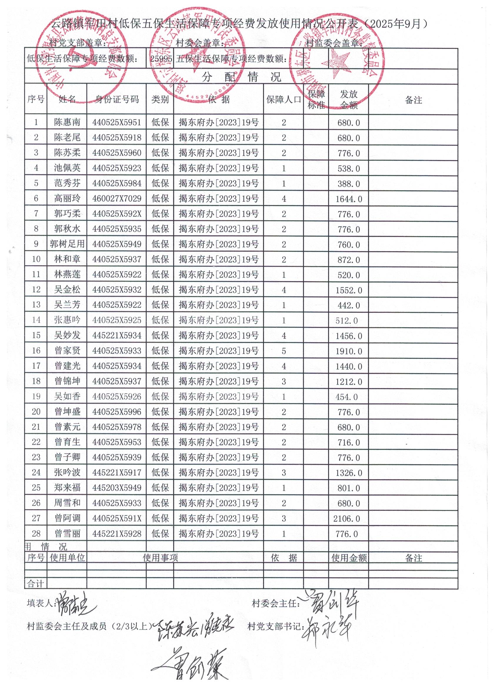 2025年9月低保、五保生活保障专项经费发放使用情况表