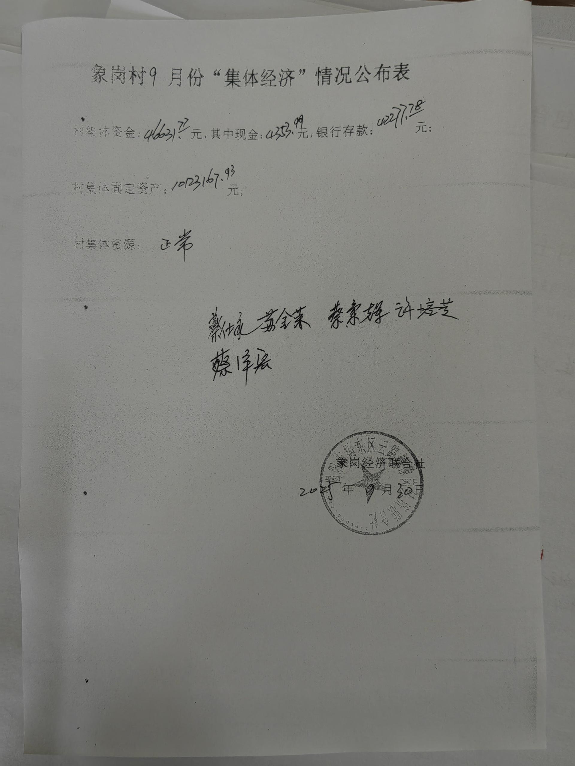 象岗村9月份集体经济情况公开表