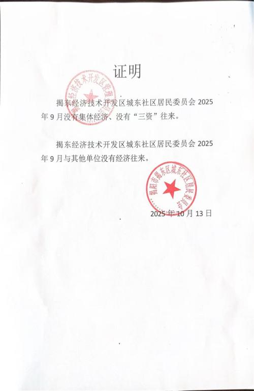 揭东经济开发区城东居委会2025年9月份集体经济收支情况