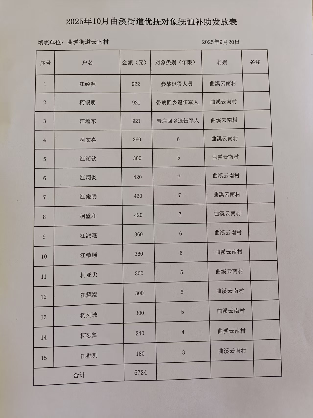 2025年10月云南村优待抚恤补助确认名册