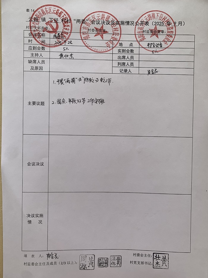 云路镇下径村村“两委”会议决议及实施情况2025年9月