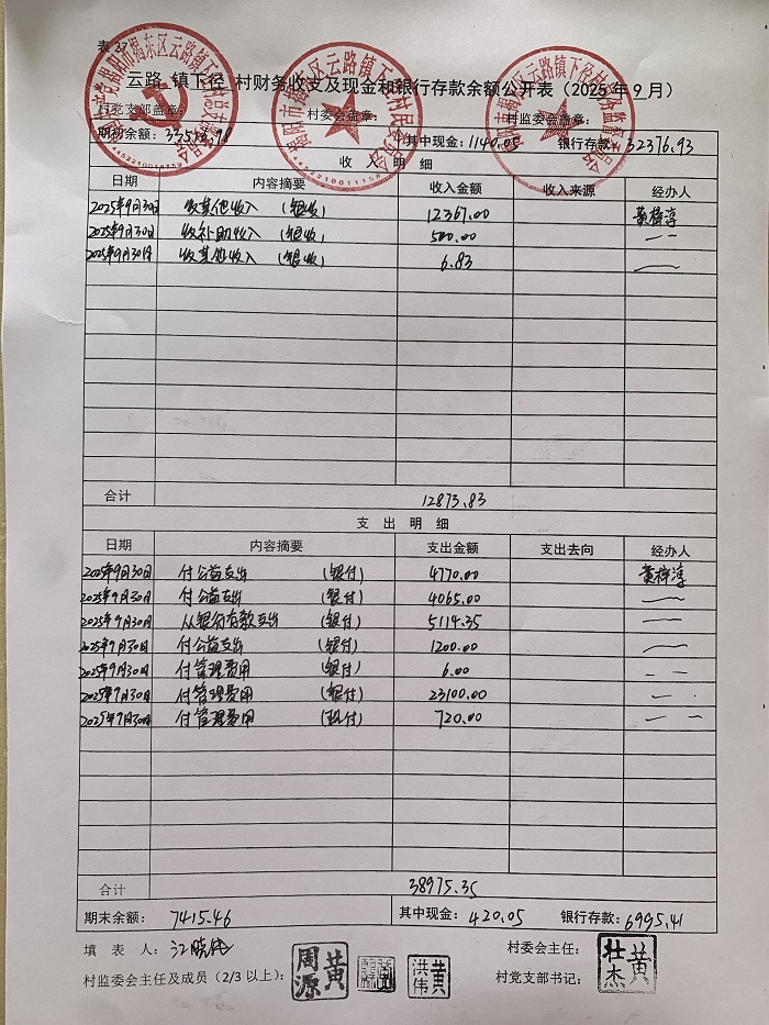 云路镇下径村财务收支及现金和银行存款余额公开表2025年9月