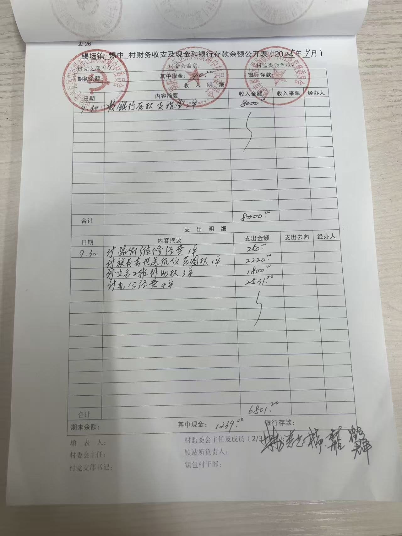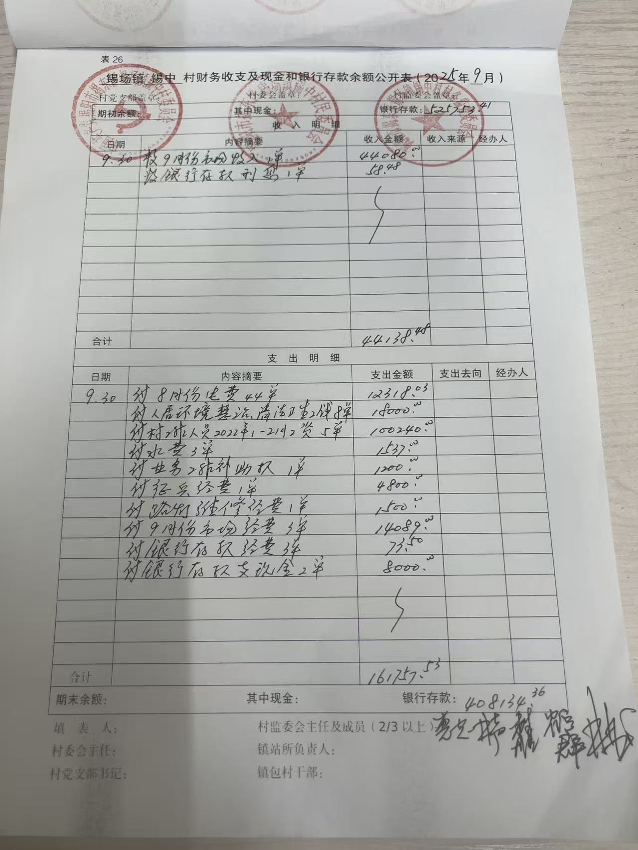 (9月份)各项收入、支出明细及现金、银行存款余额