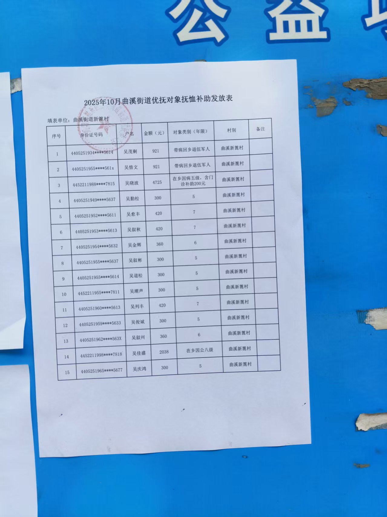 2025年10月曲溪街道优抚对象抚恤补助发放表