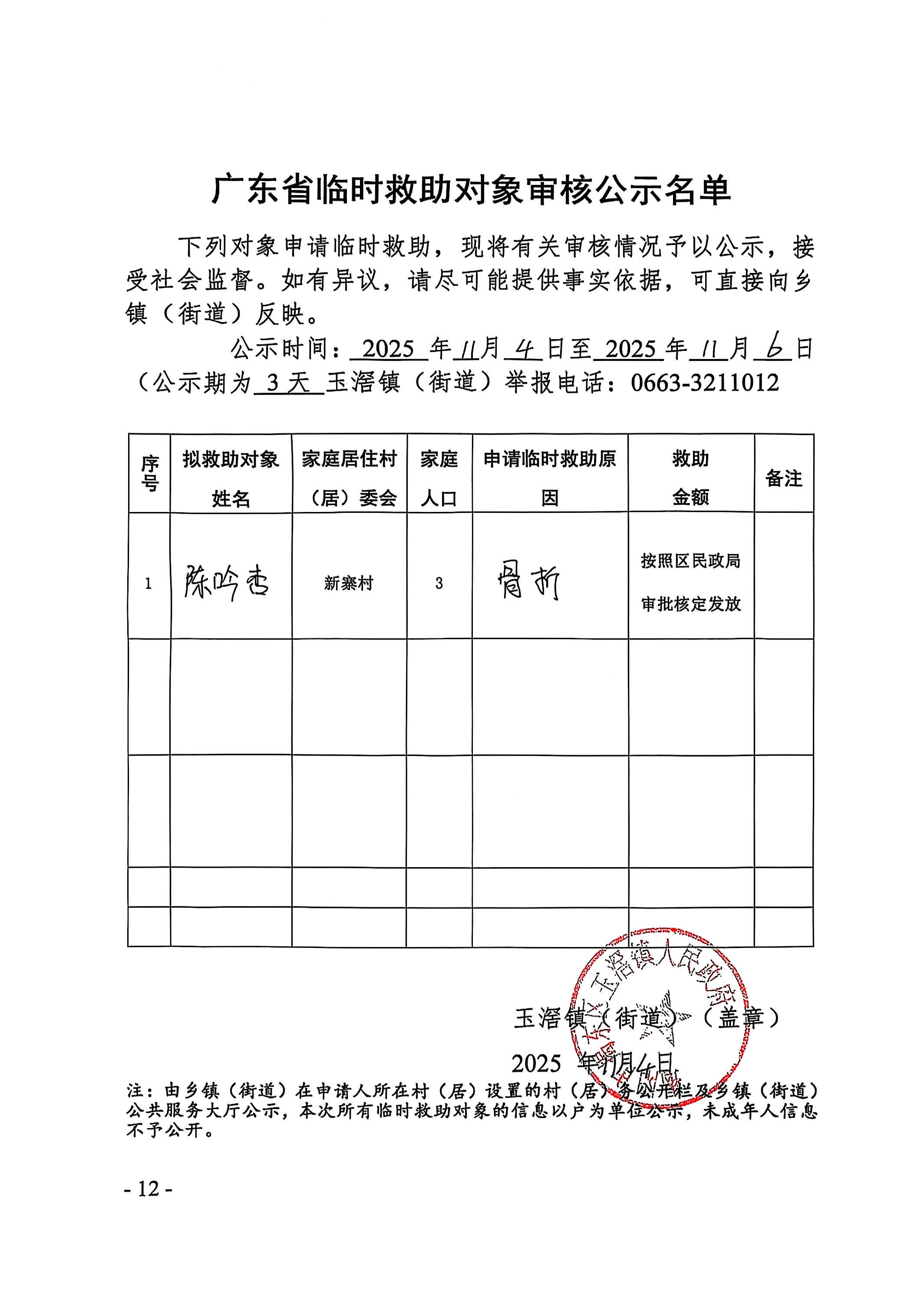 2025年11月广东省临时救助对象审核公示名单(玉滘镇新寨村)
