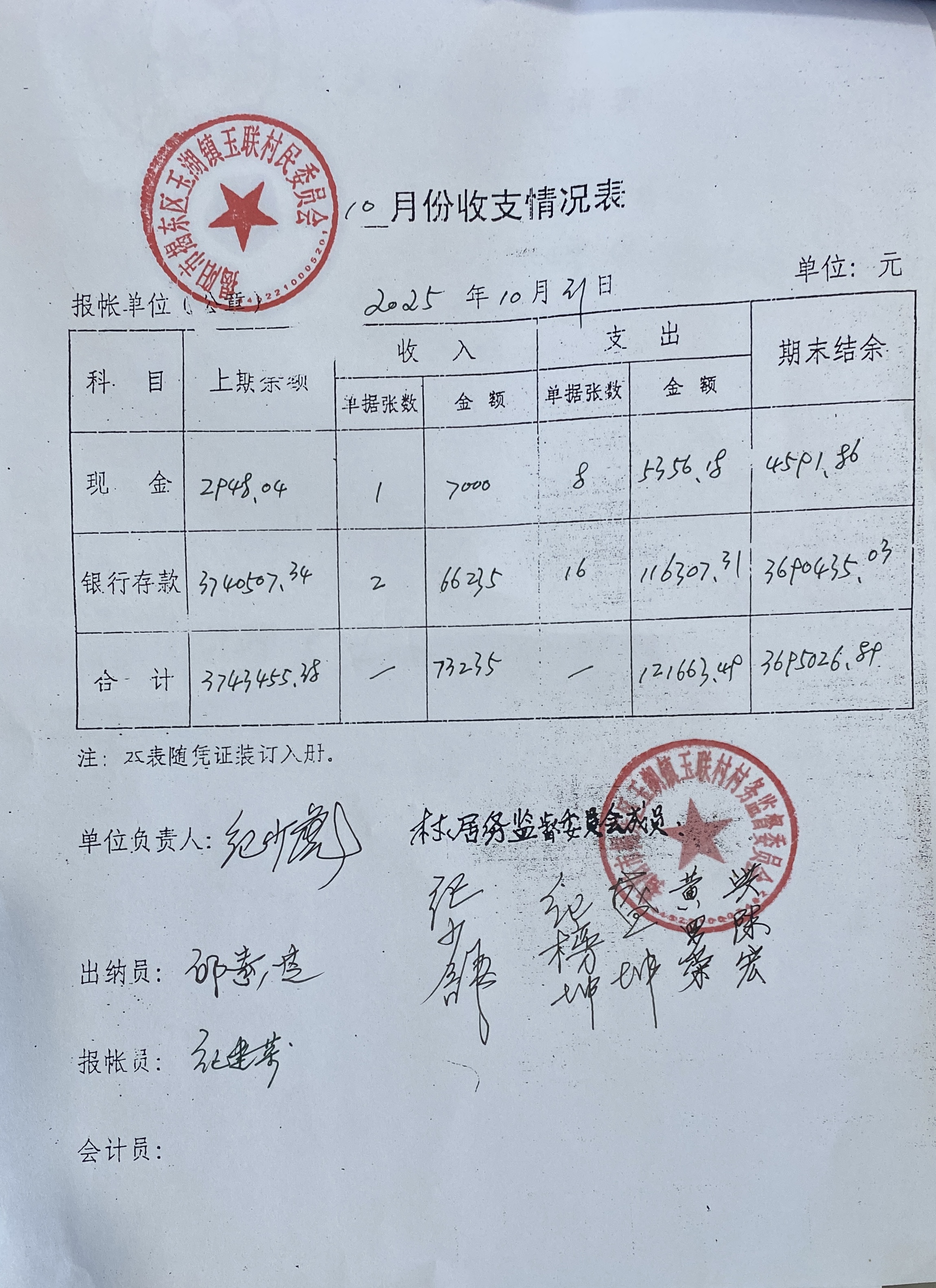 玉联村2025年10月收支情况表