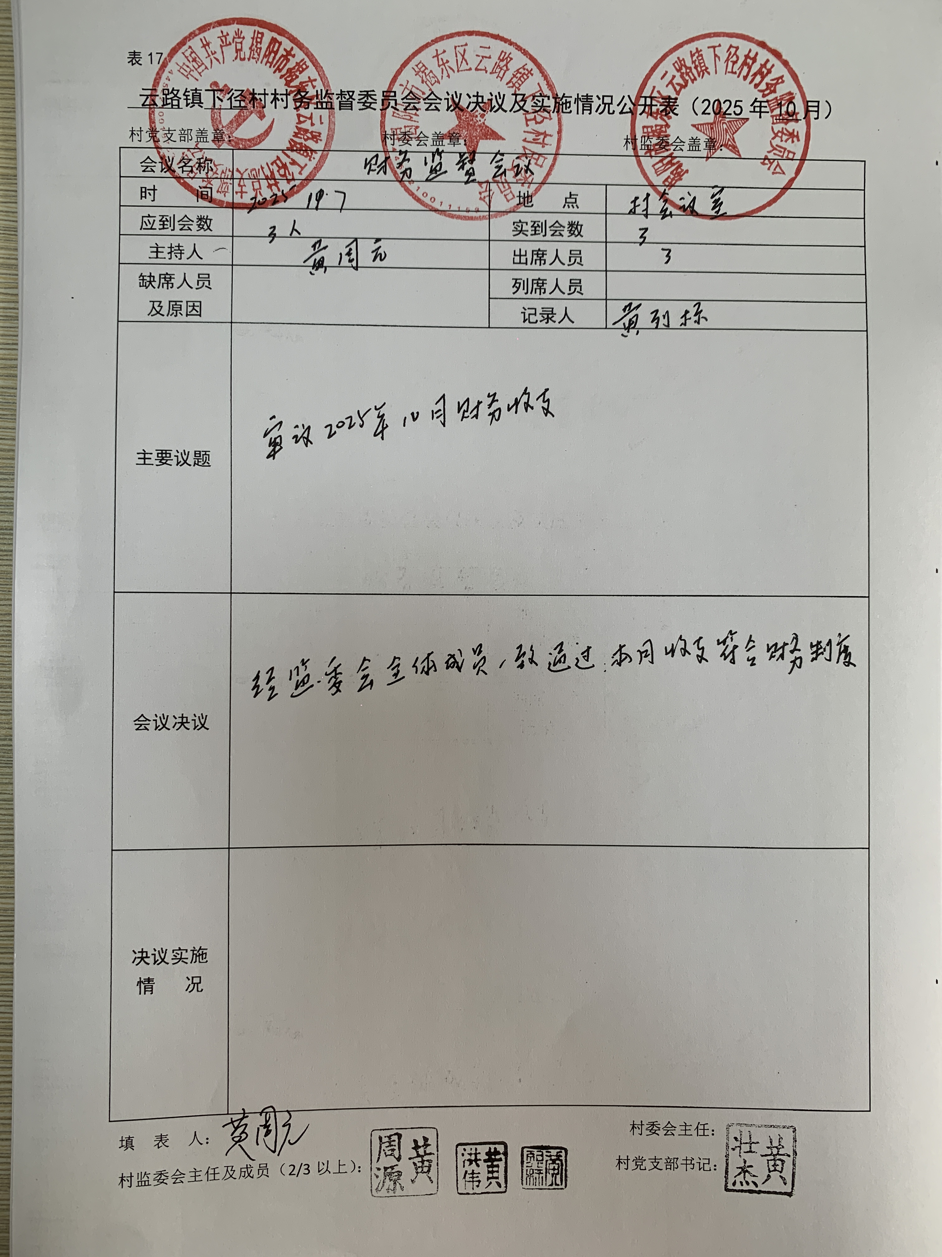 云路镇下径村村务监督委员会会议决议及实施情况2025年10月