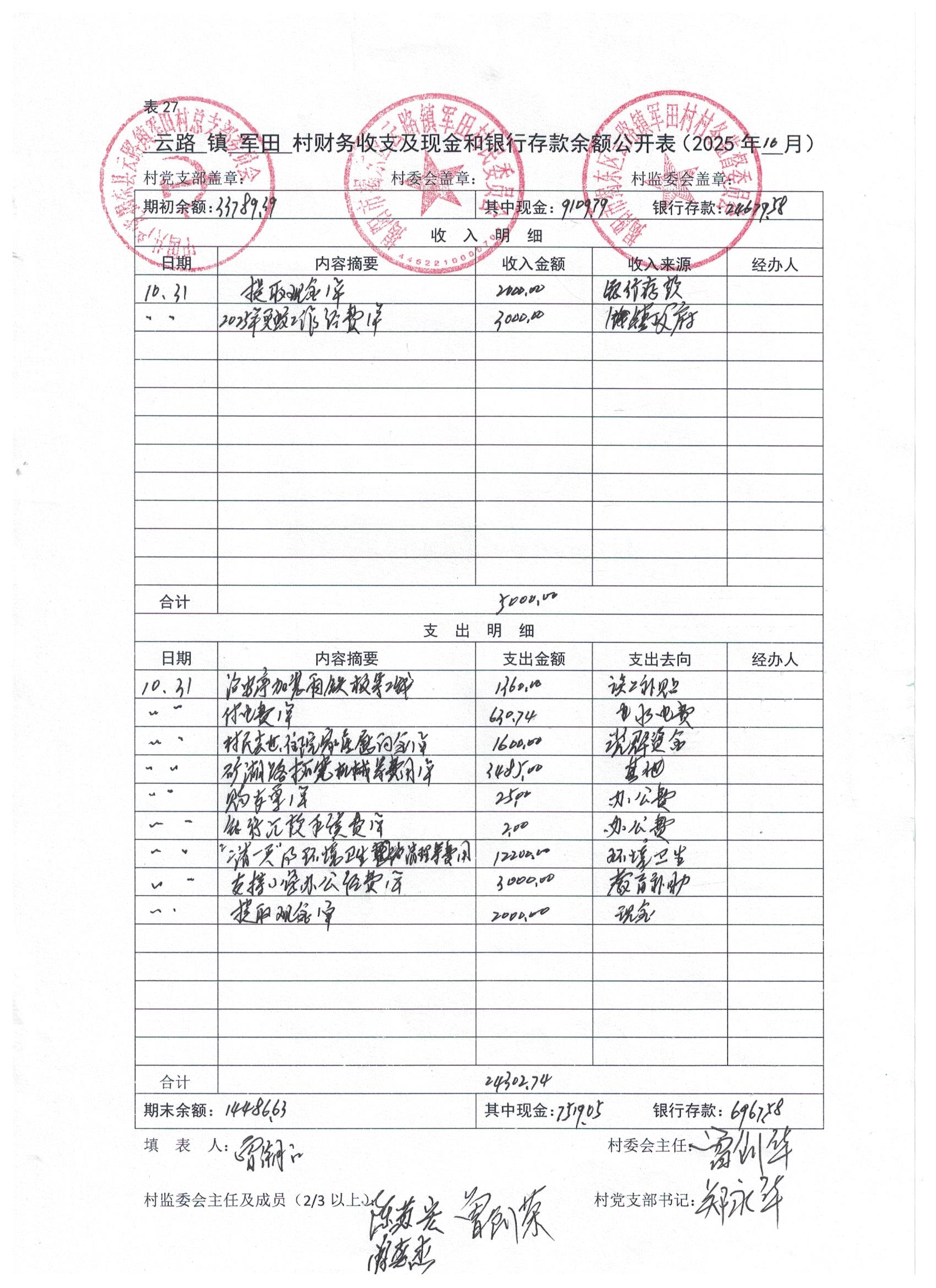 云路镇军田村财务收支及现金和银行存款余额公开表 (2025年10月)