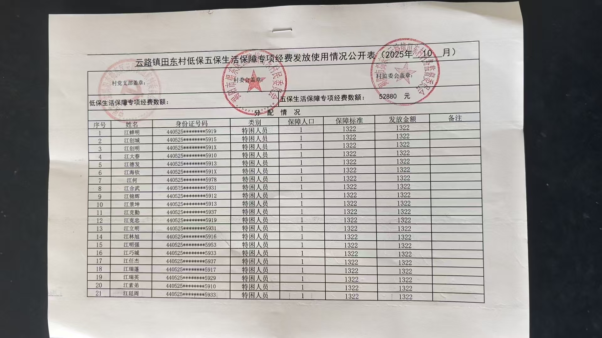 田东村2025年10月五保公示