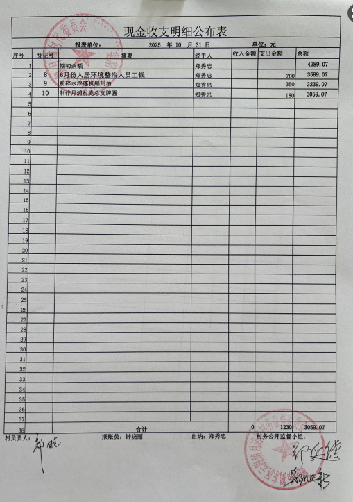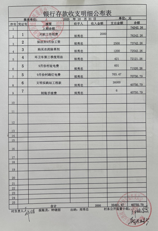 月浦村各项收入、支出明细及现金、银行存款余额2025年10月
