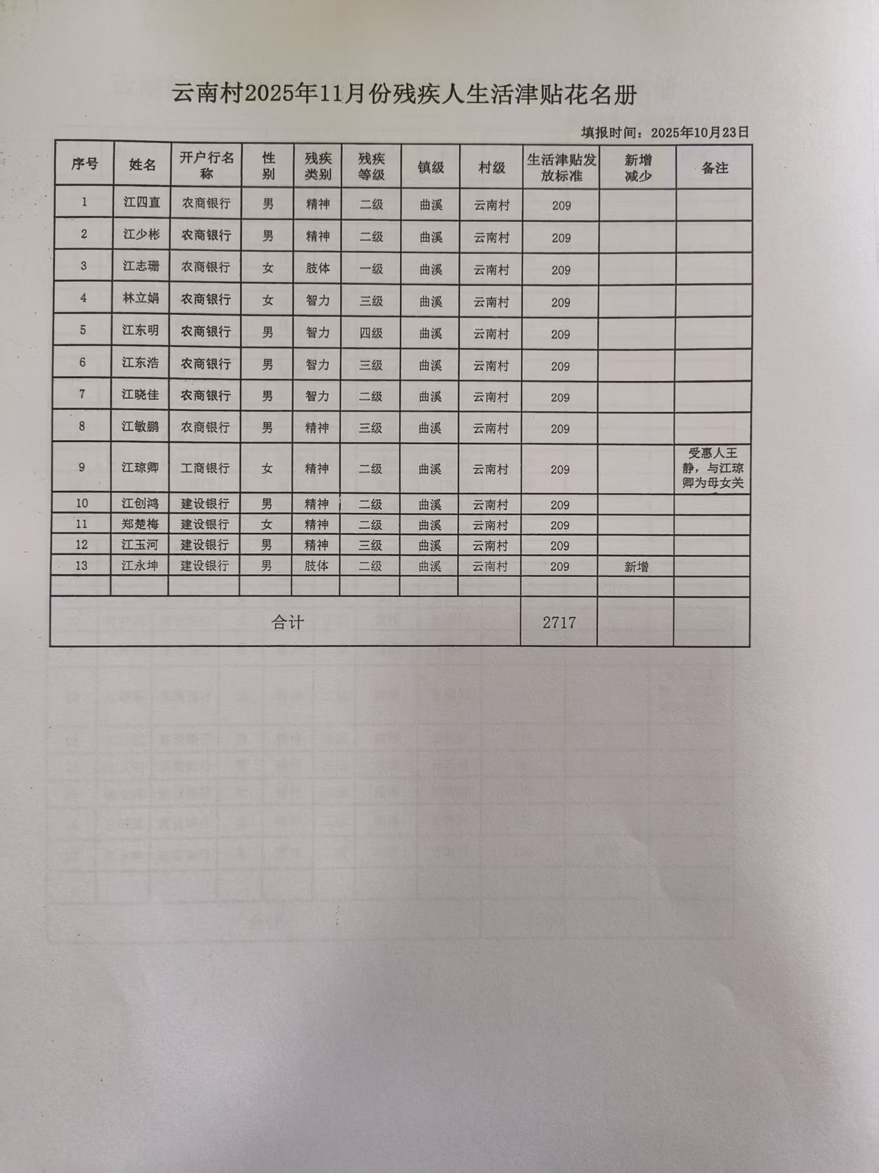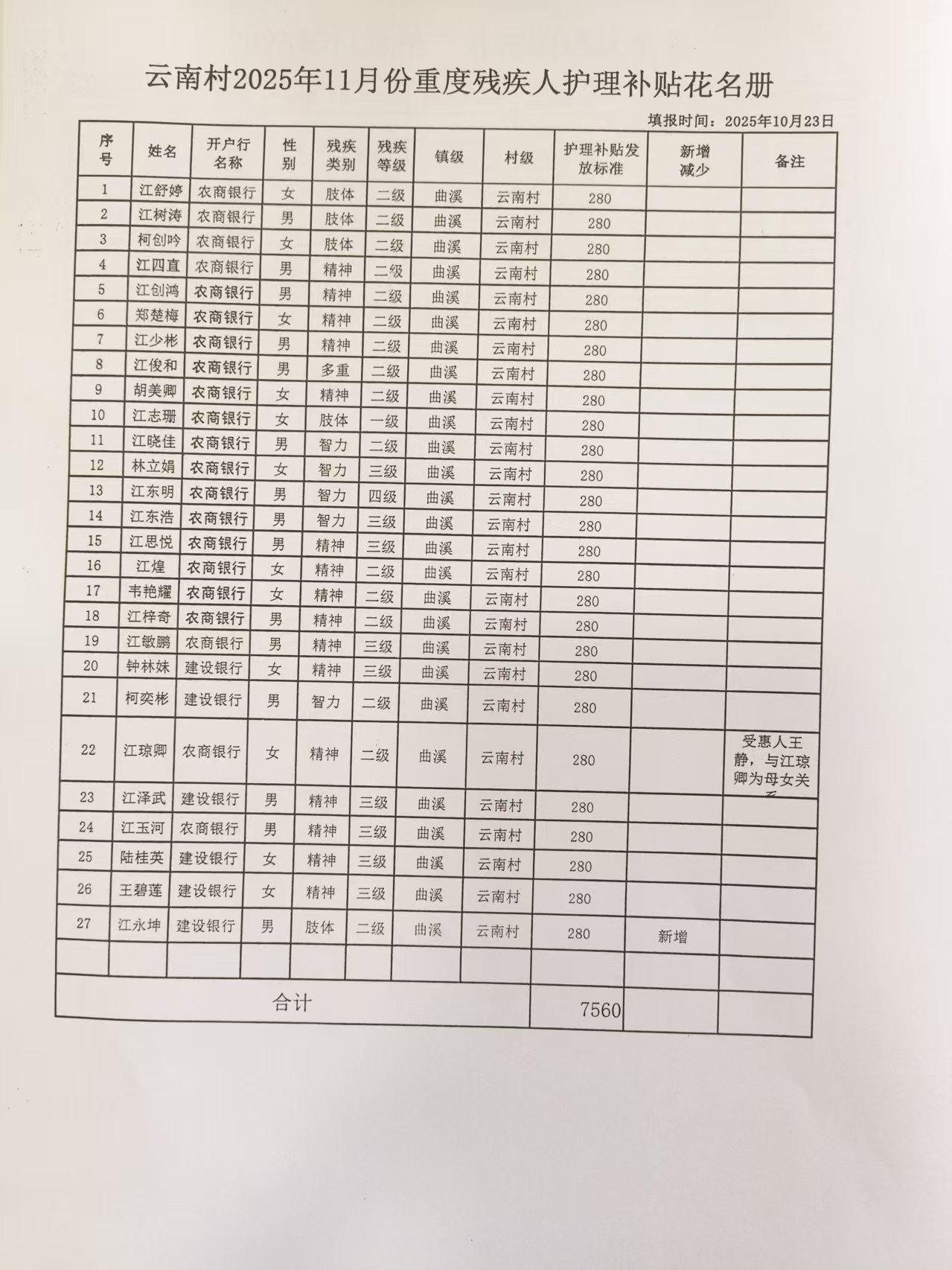 2025年11月云南村残疾人保障专项经费发放确认名册