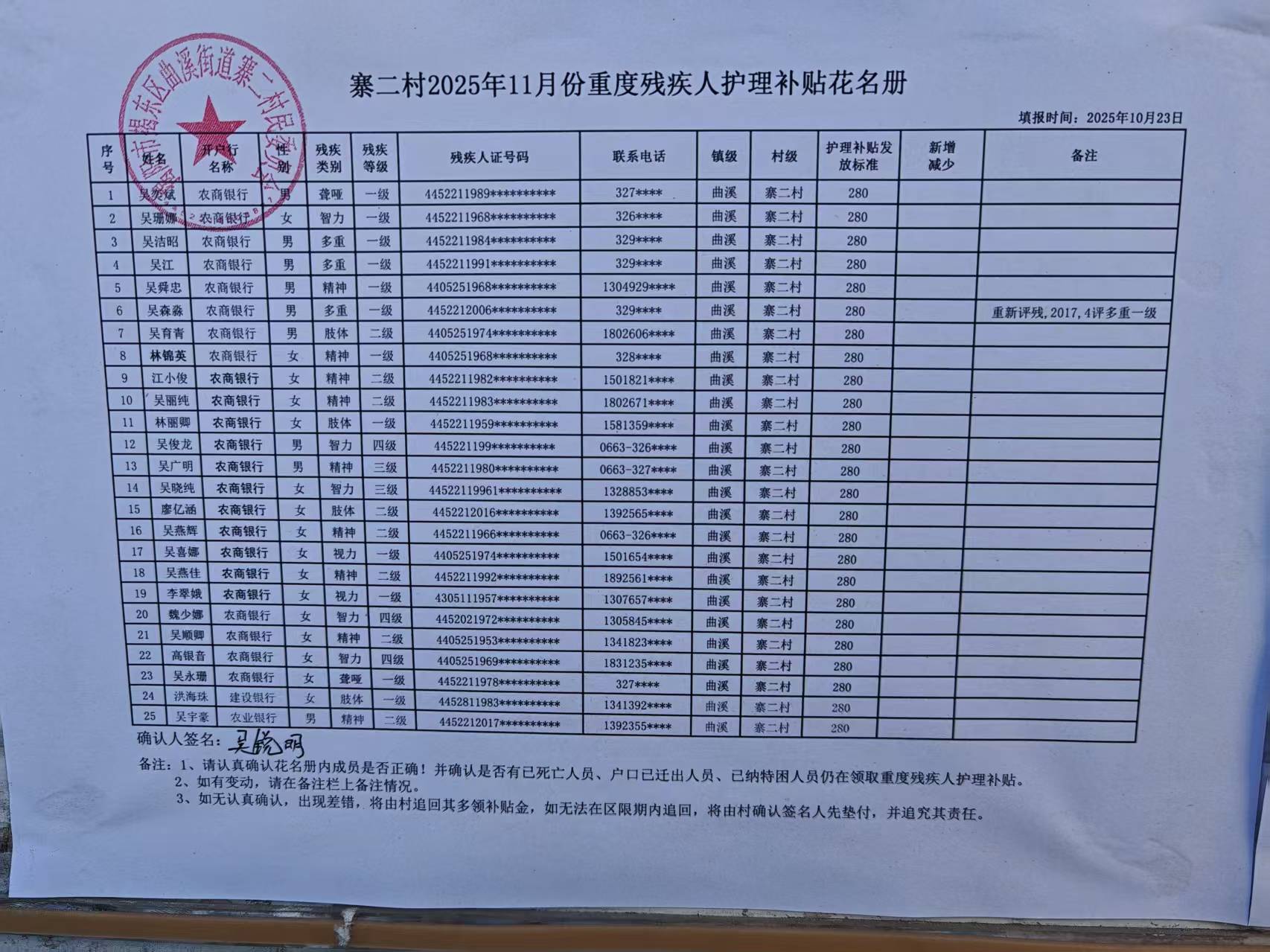 寨二村2025年11月份重度残疾人护理补贴花名册