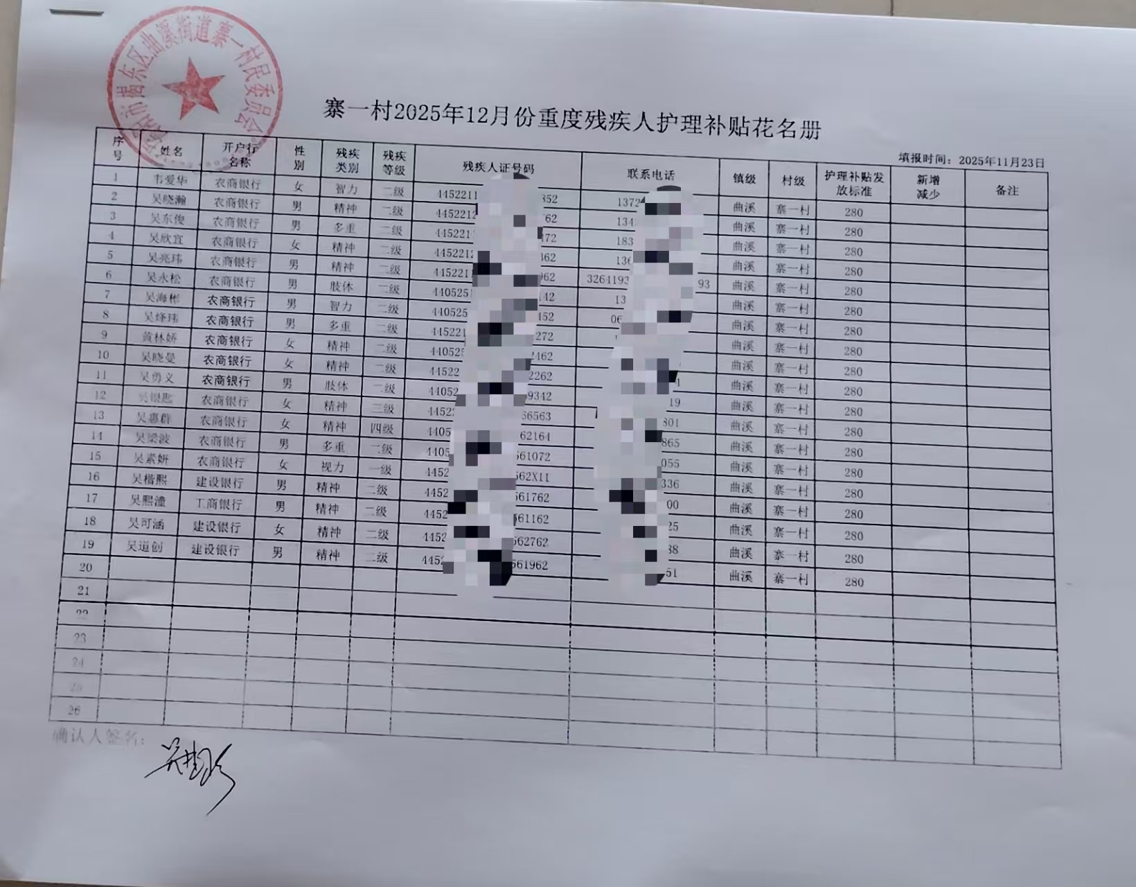 寨一村2025年12月份重度残疾人护理补贴花名册