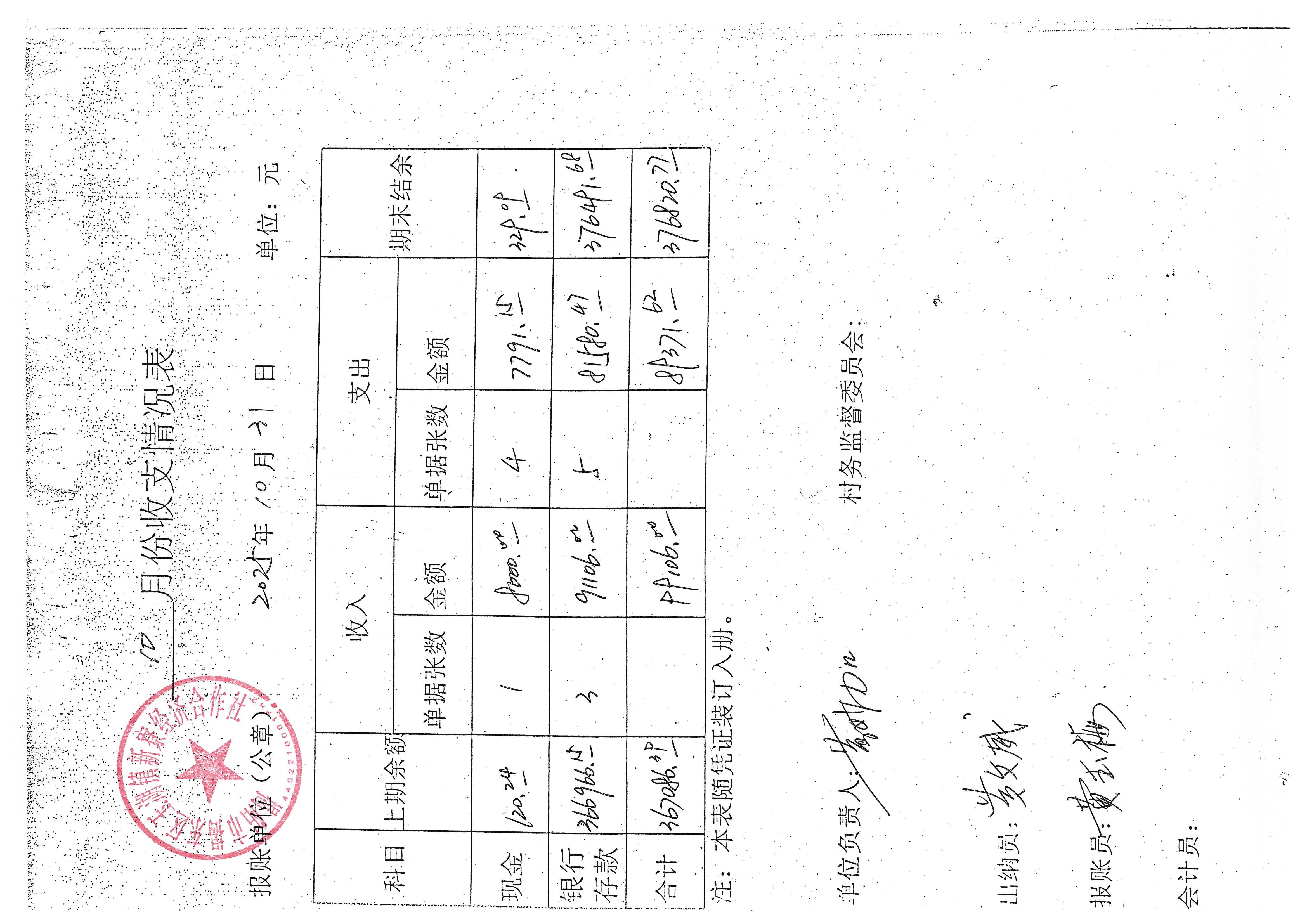 新寮村2025年10月份财务收支情况