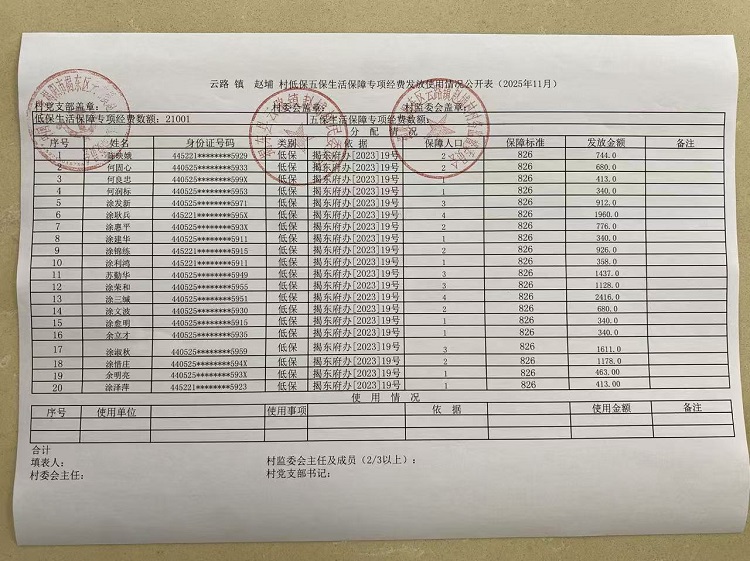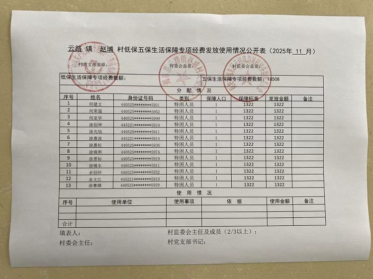 2025年11月低保、五保生活保障专项经费发放使用情况