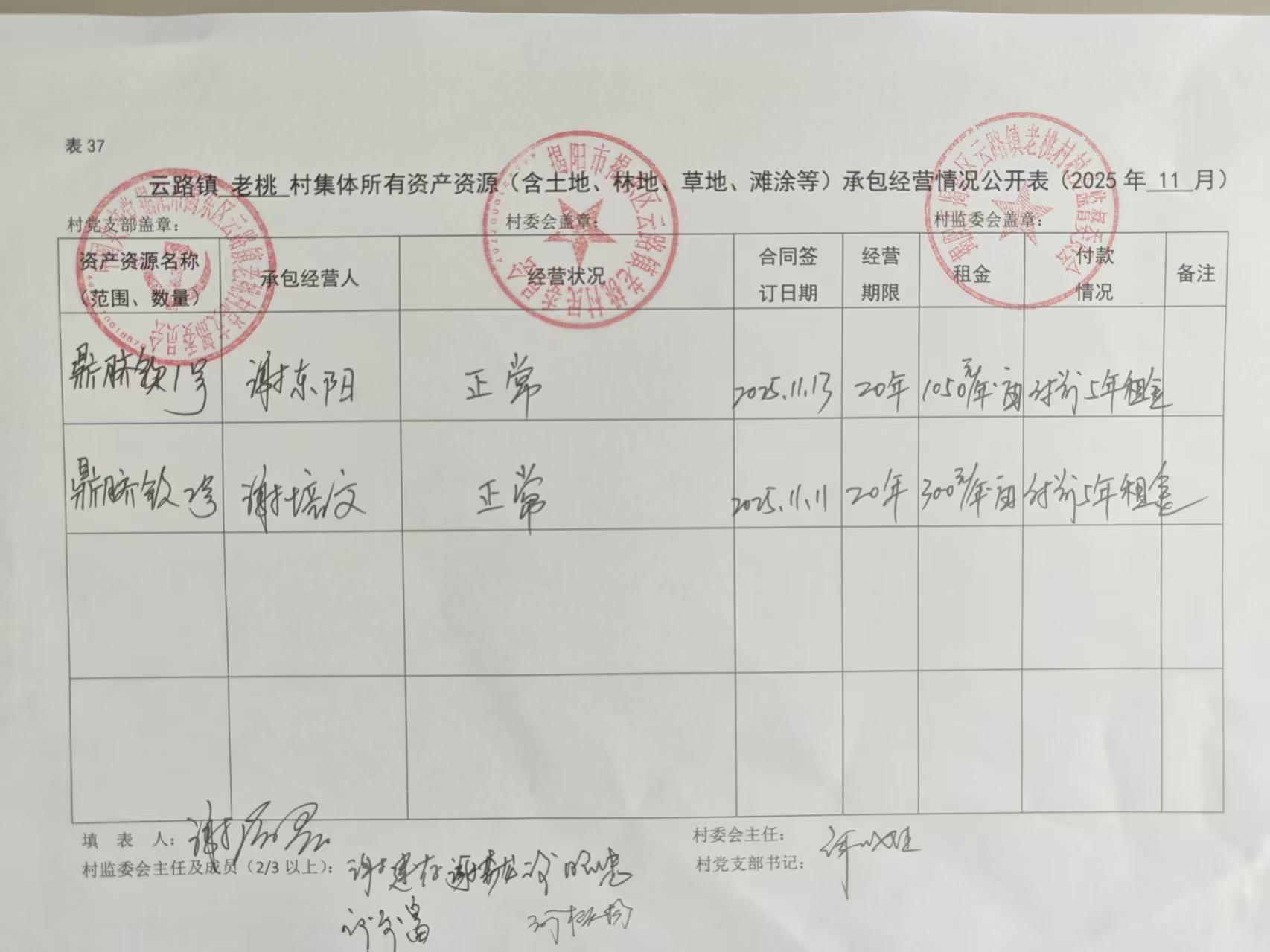 2025年云路镇老桃村集体所有资产资源(含土地、林地、草地、滩涂等)承包经营情况公开表(11月份)