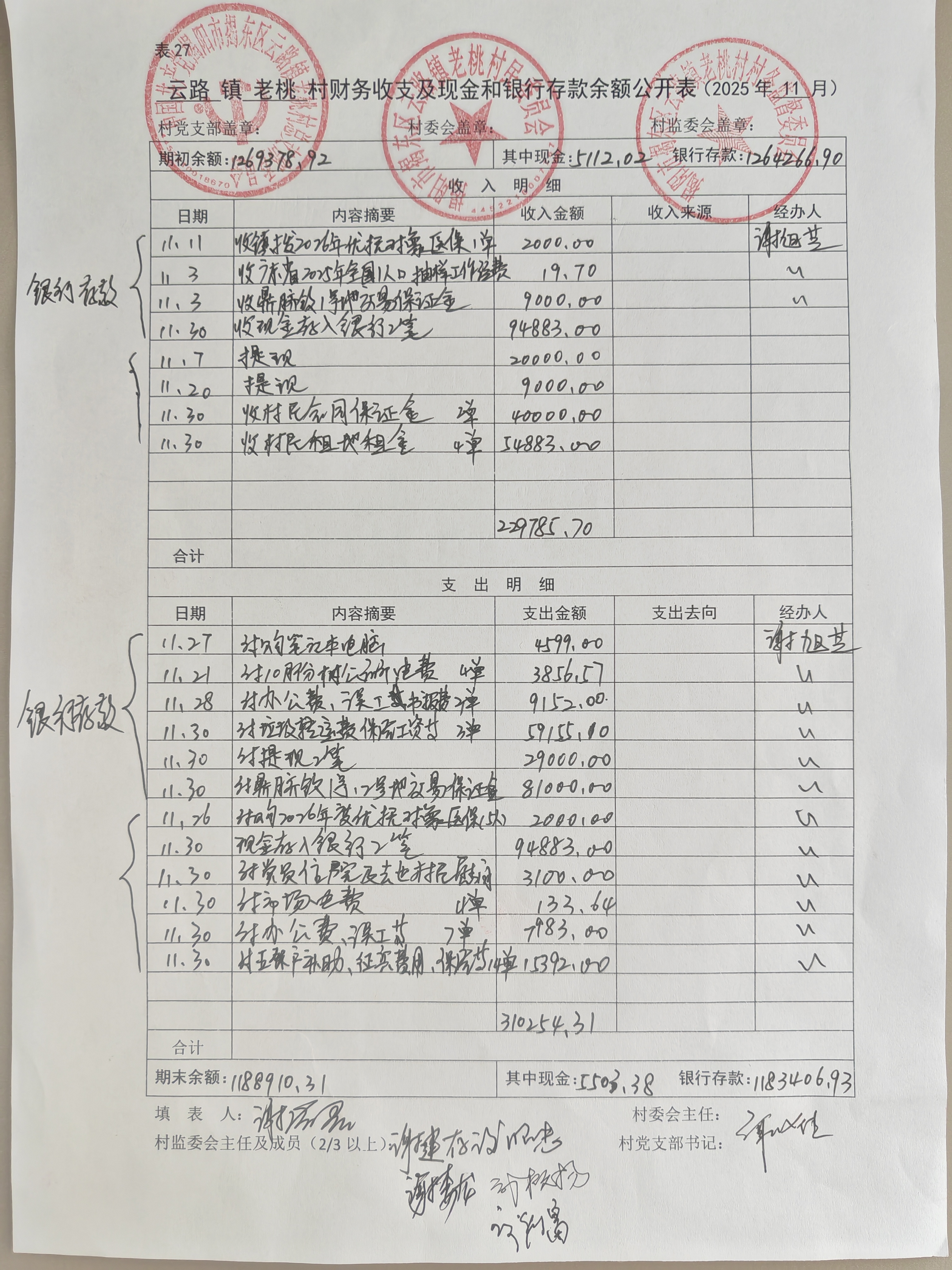 2025年11月份云路镇老桃村财务收支及现金和银行存款余额公开表
