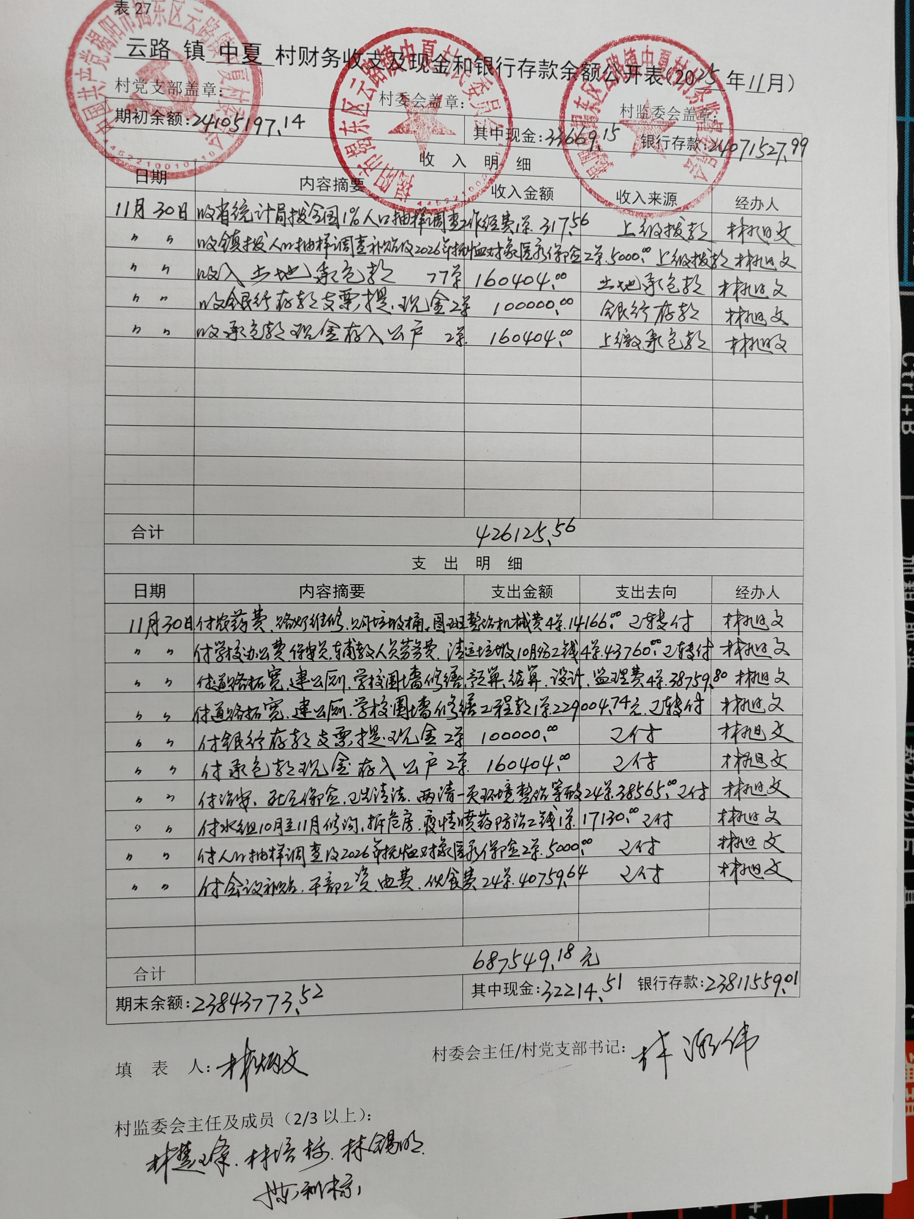 中夏村2025年11月份财务收支情况
