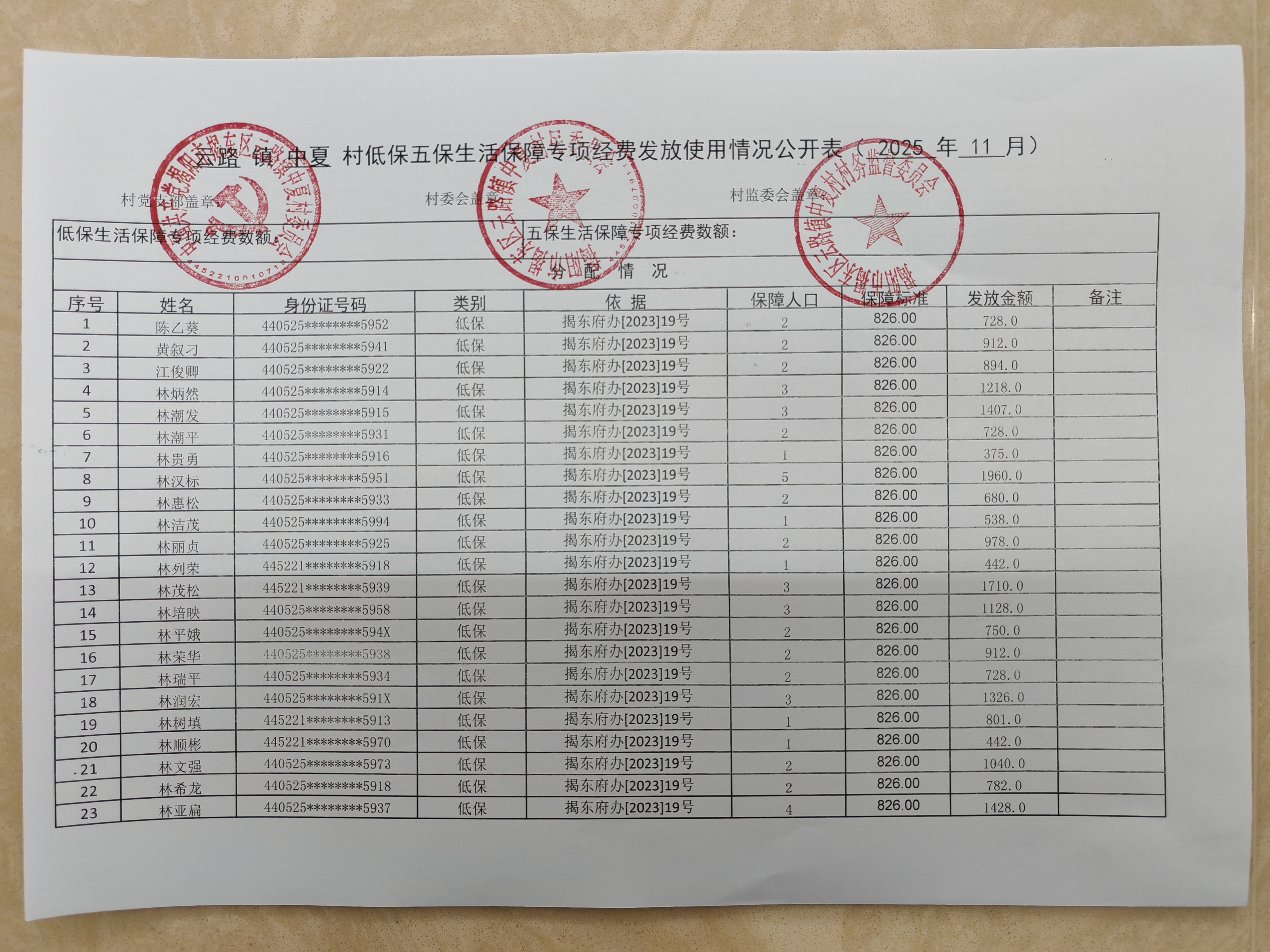 2025年11月份低保生活保障专项经费发放情况