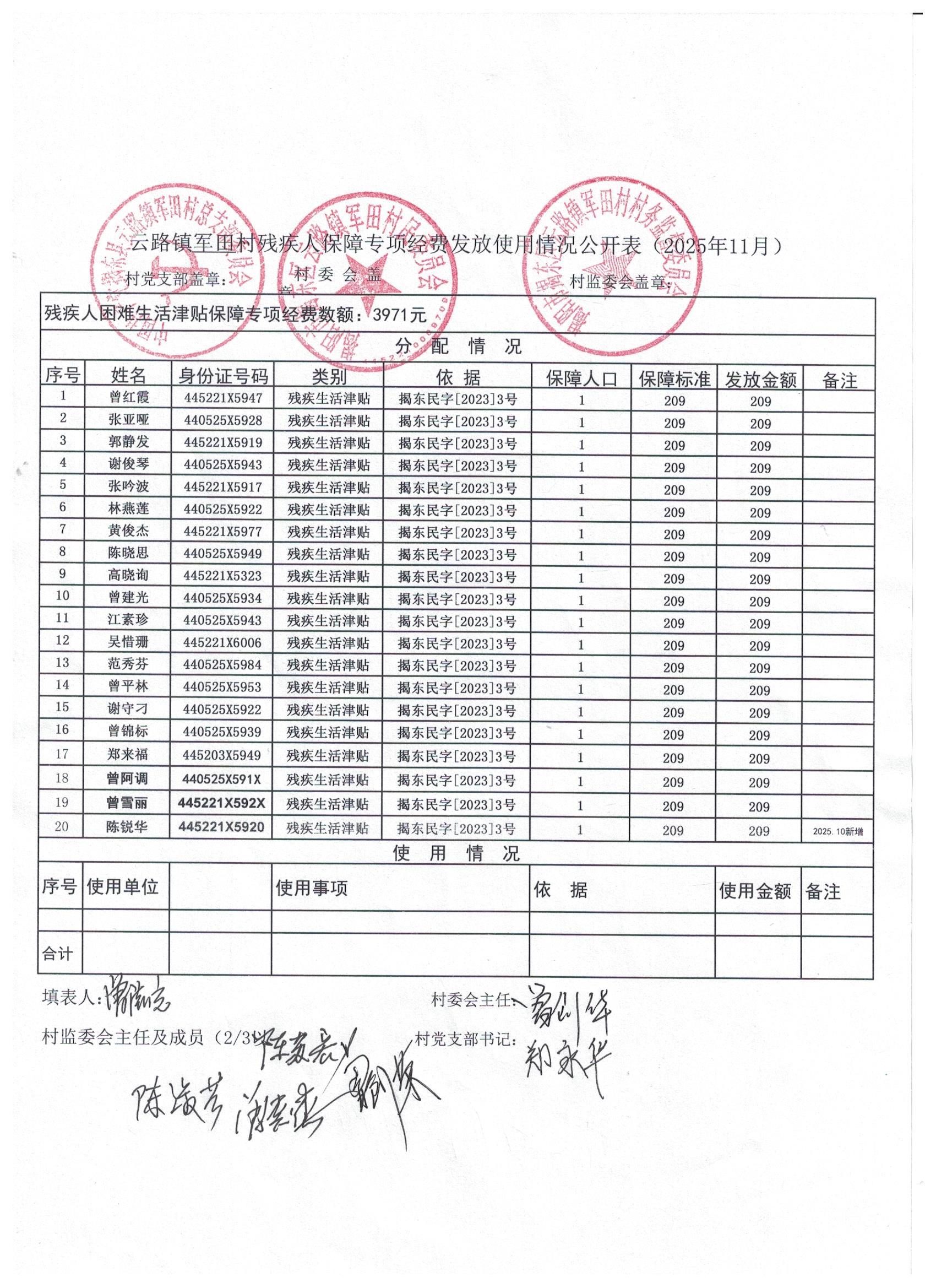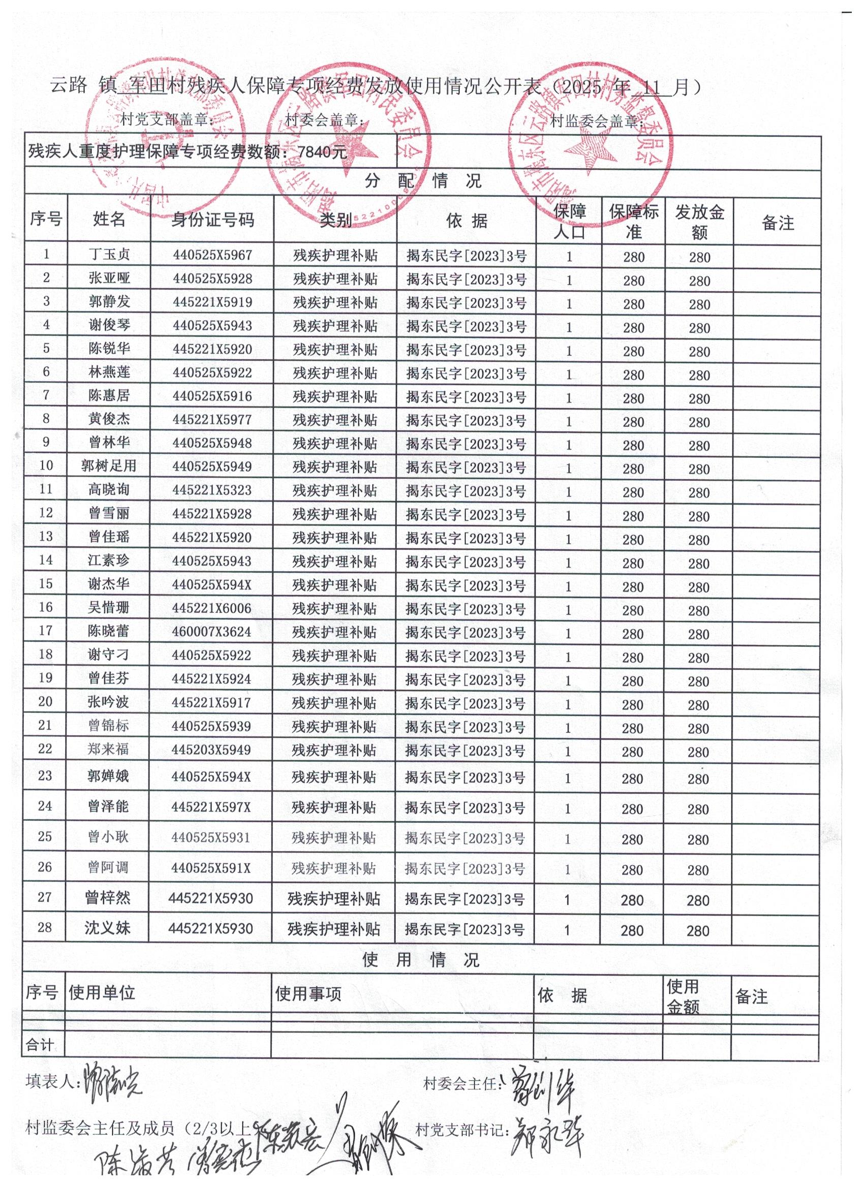 2025年11月残疾人保障专项经费发放使用情况公开表