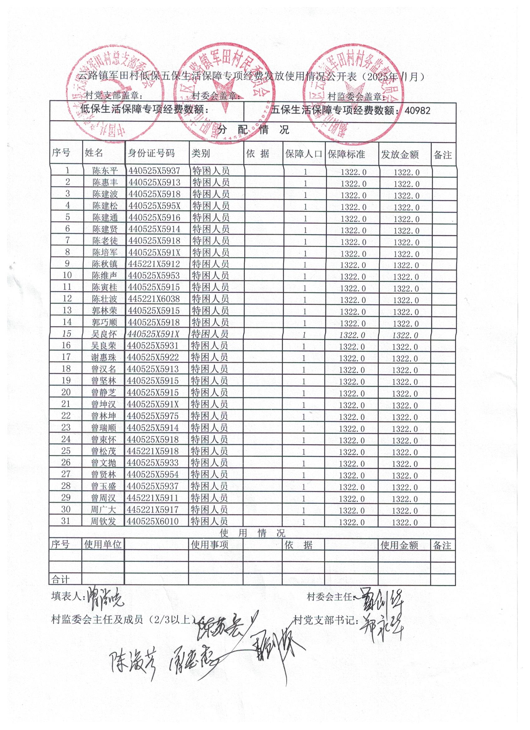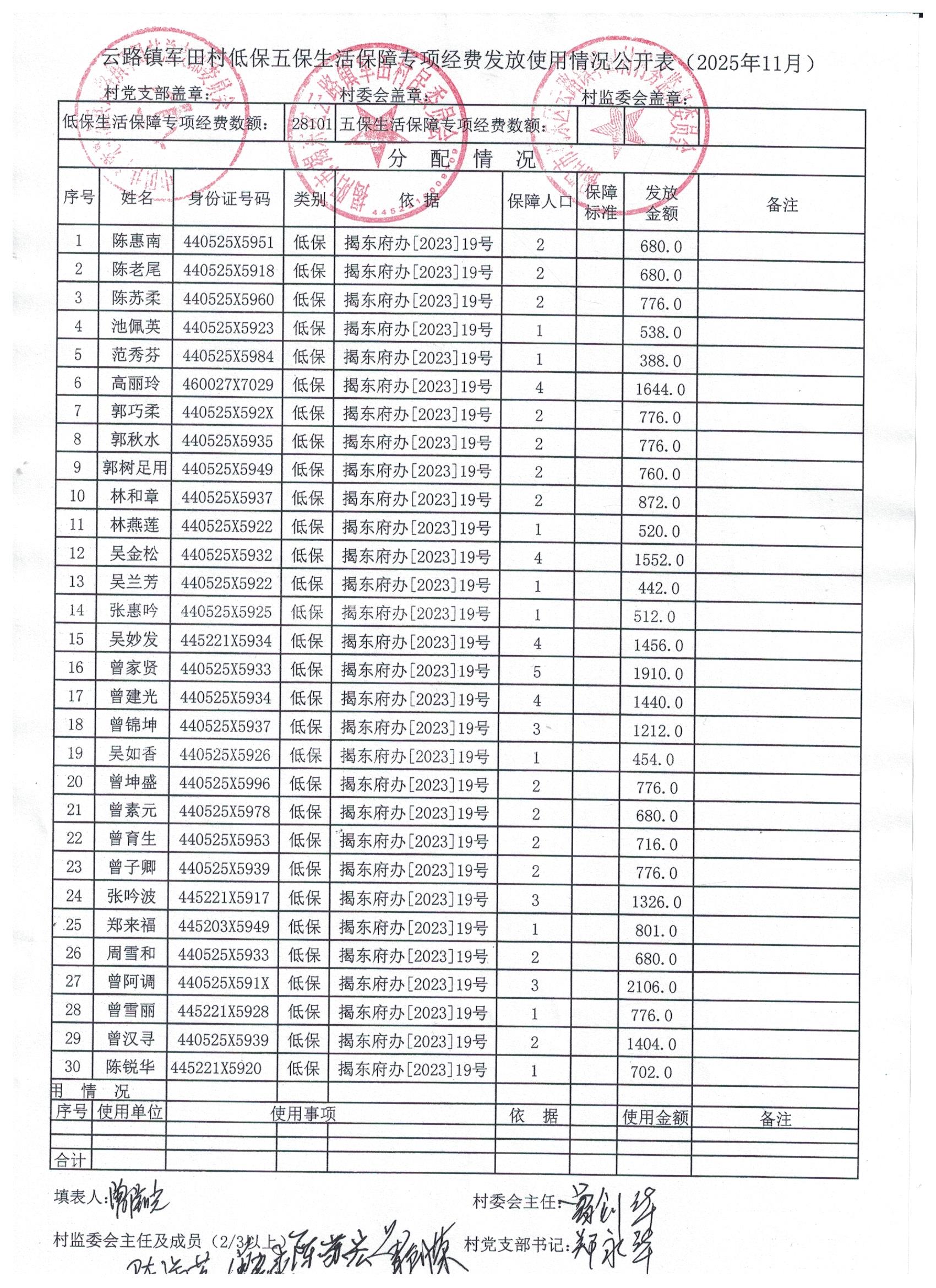 2025年11月低保、五保生活保障专项经费发放使用情况表