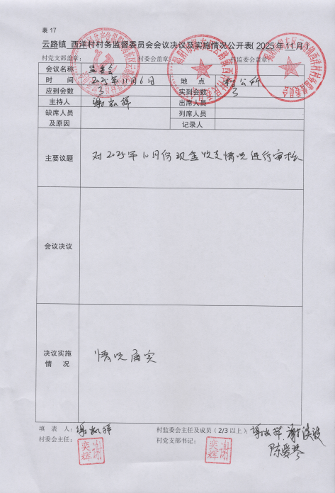 西洋村村务监督委员会会议决议及实施情况(2025年11月)