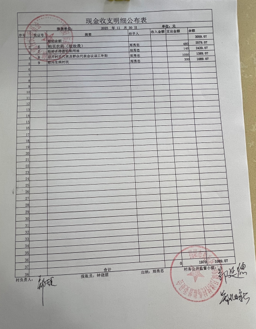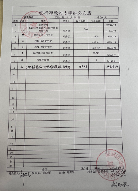 月浦村各项收入、支出明细及现金、银行存款余额2025年11月