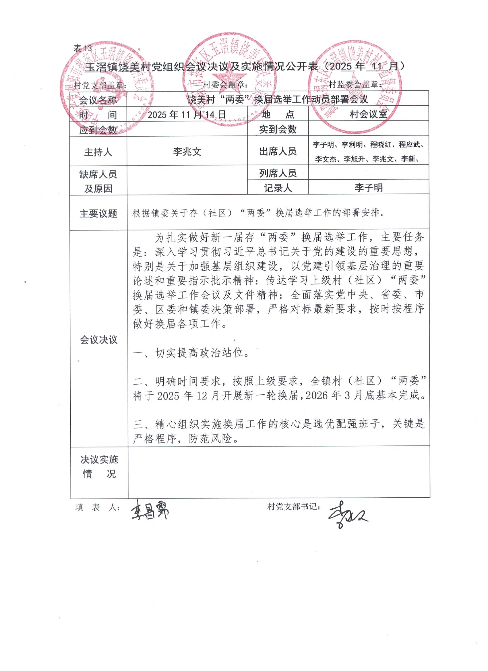 饶美村2025年11月14日饶美村党组织会议决议及实施情况