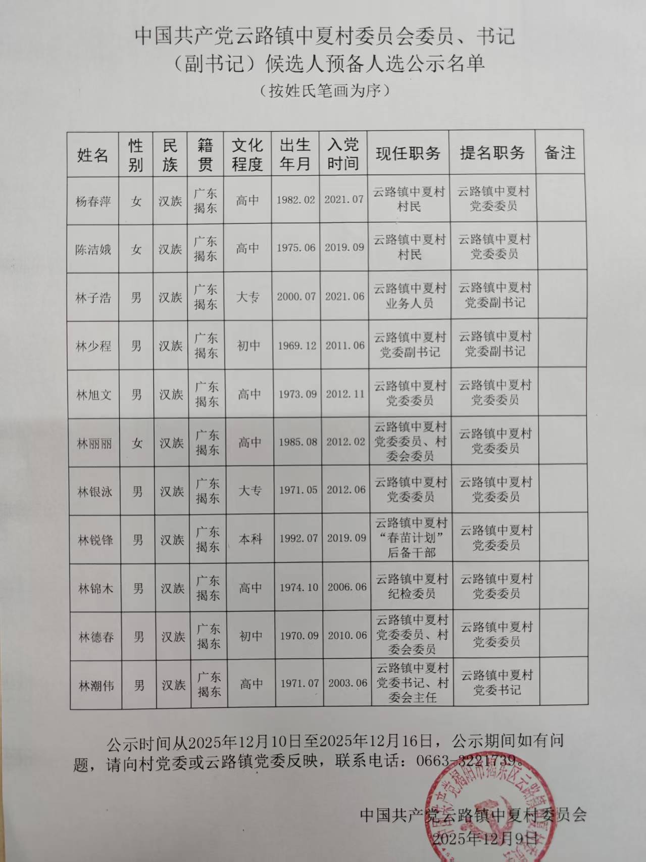 中国共产党云路镇中夏村总支部委员会委员、书记(副书记)候选人预备人选公示名单