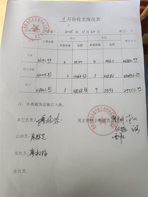 五房村2025年11月各项收入、支出明细及现金、银行存款余额