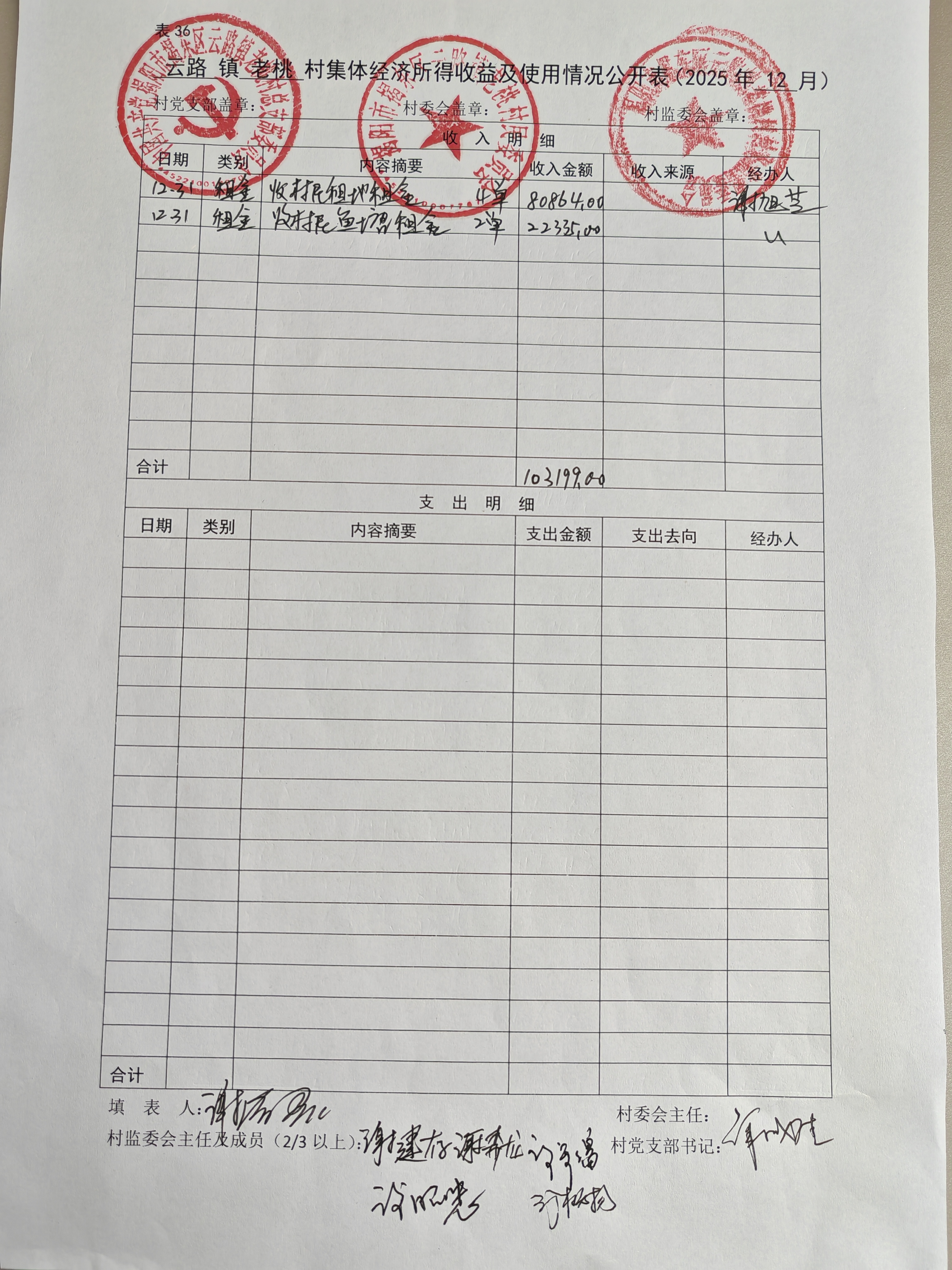 2025年12月份云路镇老桃村集体经济所得收益及使用情况公开表