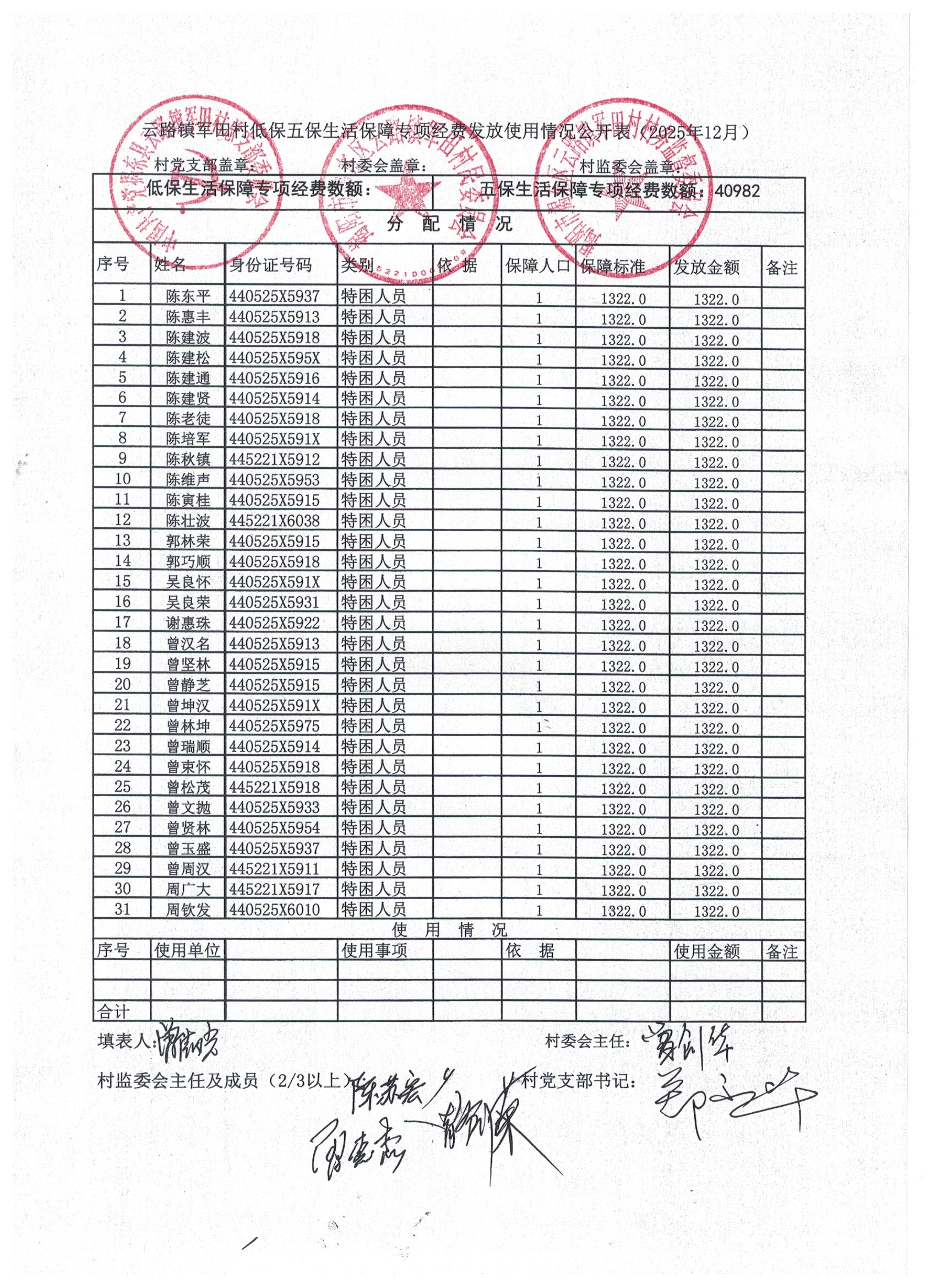 2025年12月低保、五保生活保障专项经费发放使用情况表