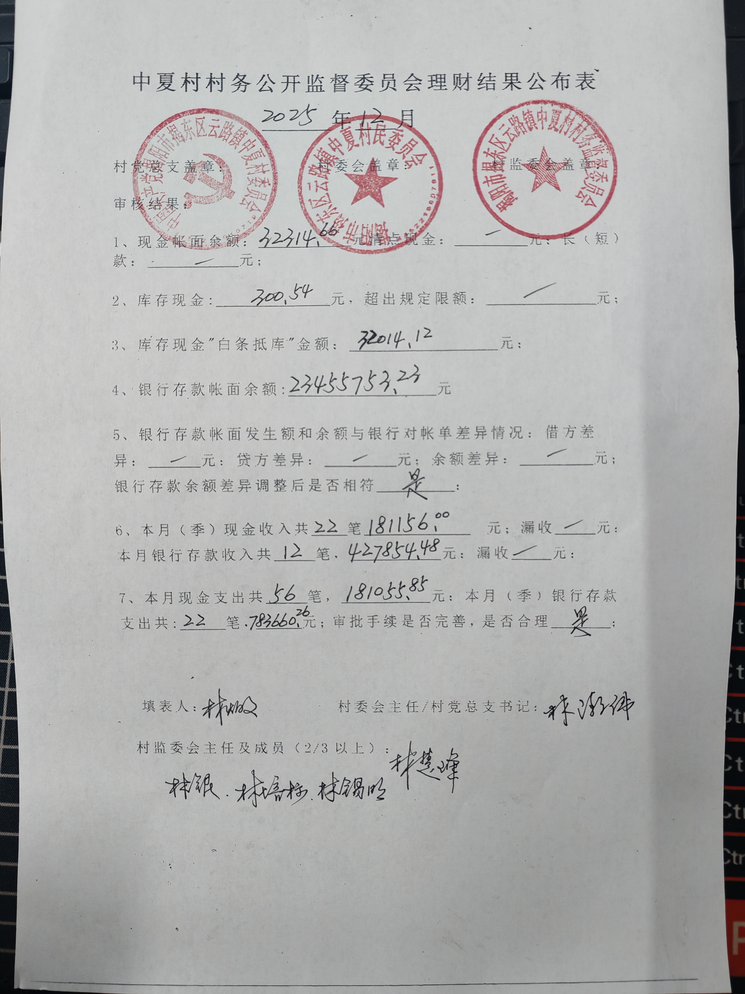 中夏村2025年12月份村务监督委员会理财结果