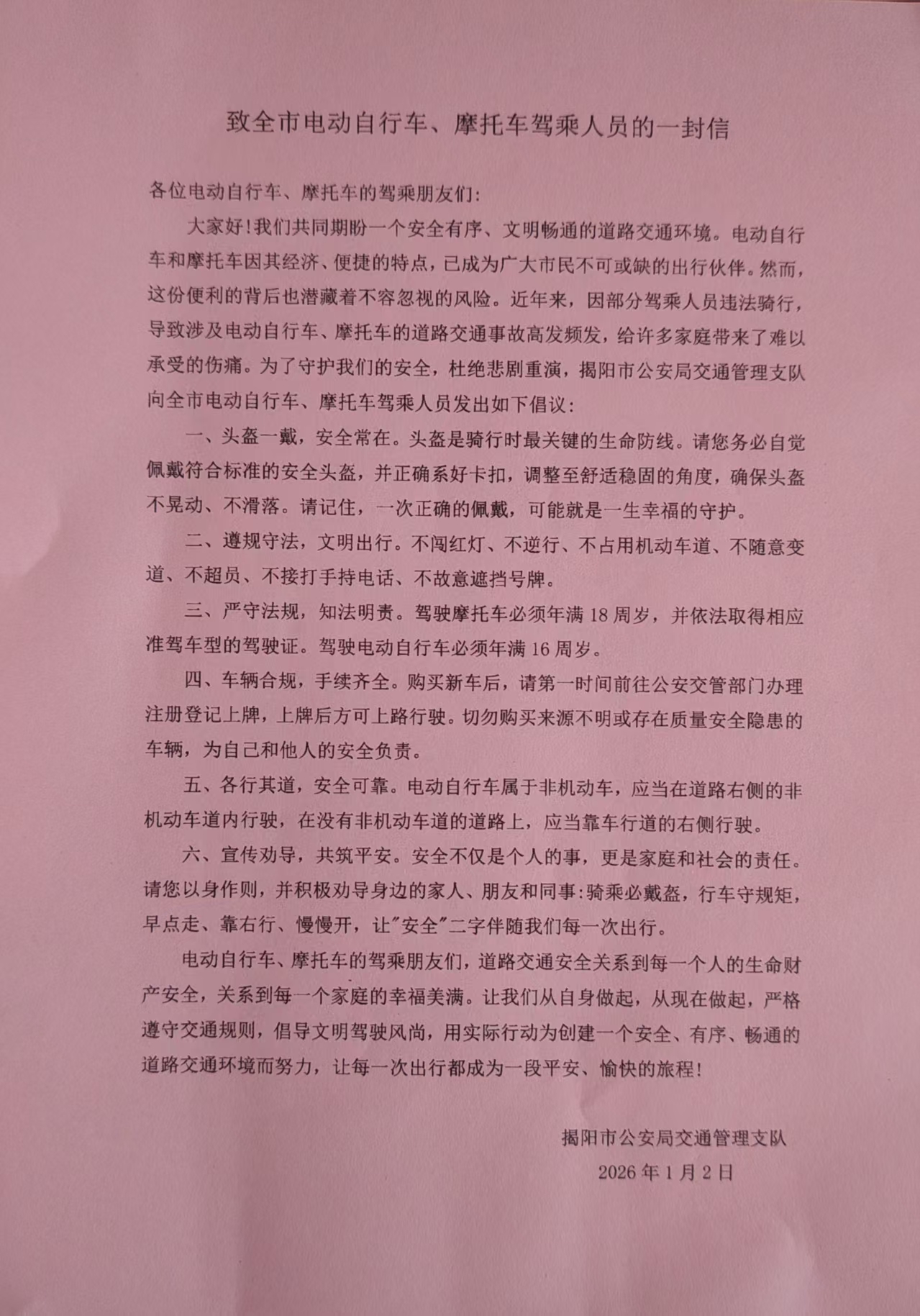 致全市电动自行车、摩托车驾乘人员的一封信