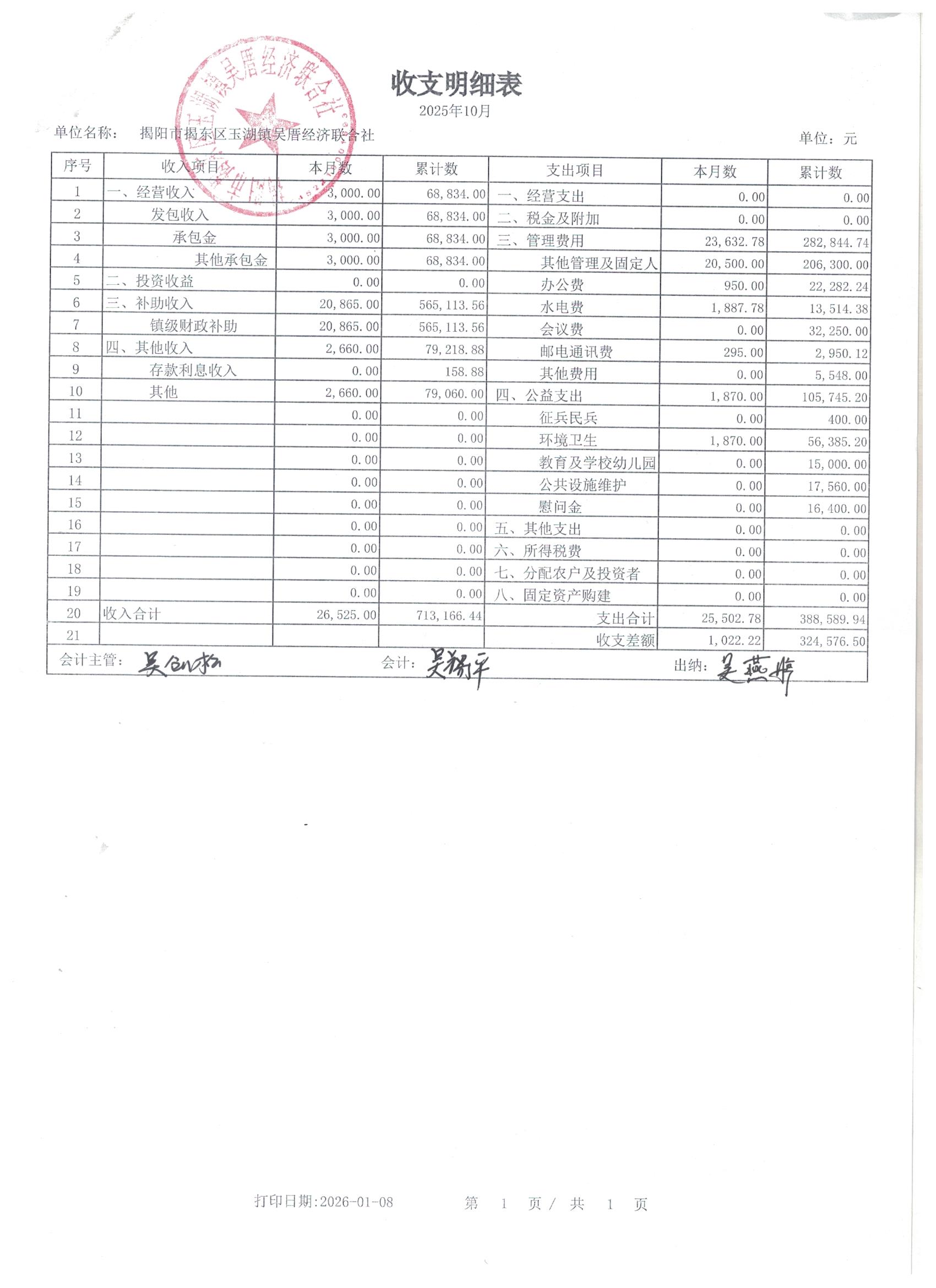 吴厝村2025年10月份收支明细表