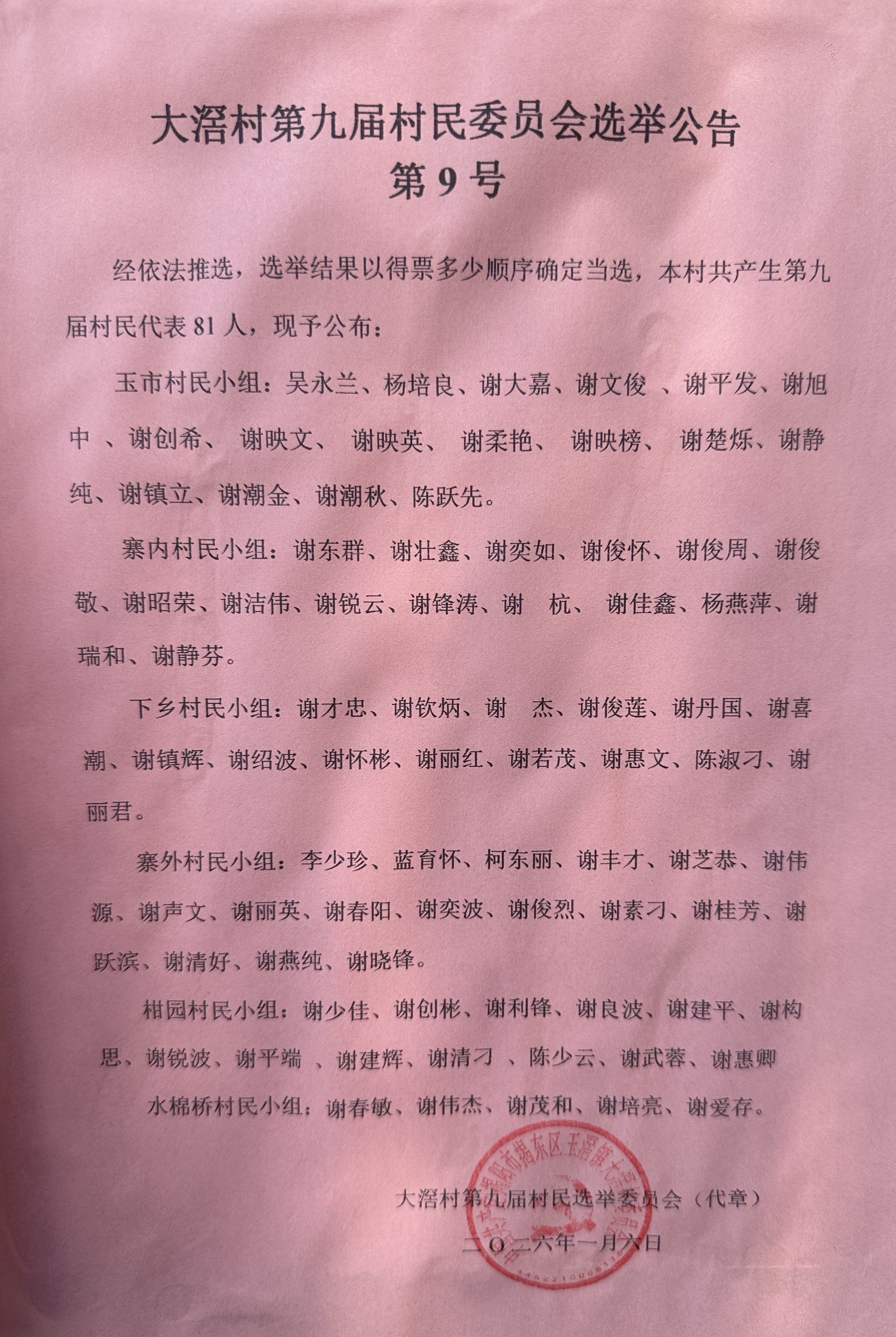 玉滘镇大滘村第九届村民委员会选举公告第9号
