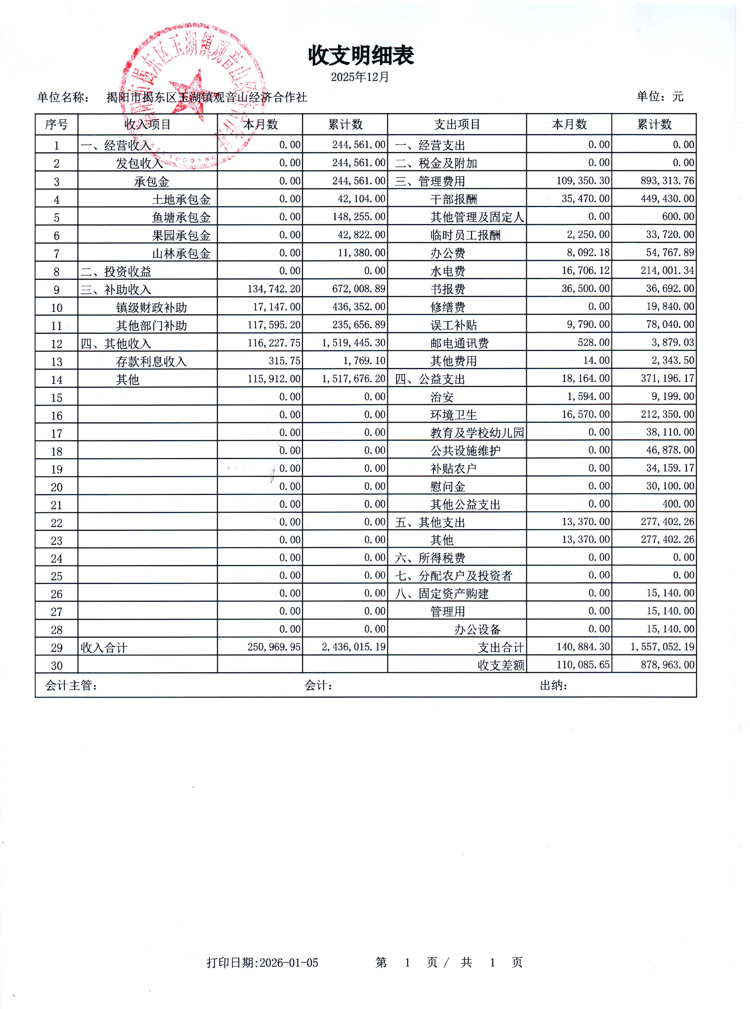 2025年12月份财务收支情况