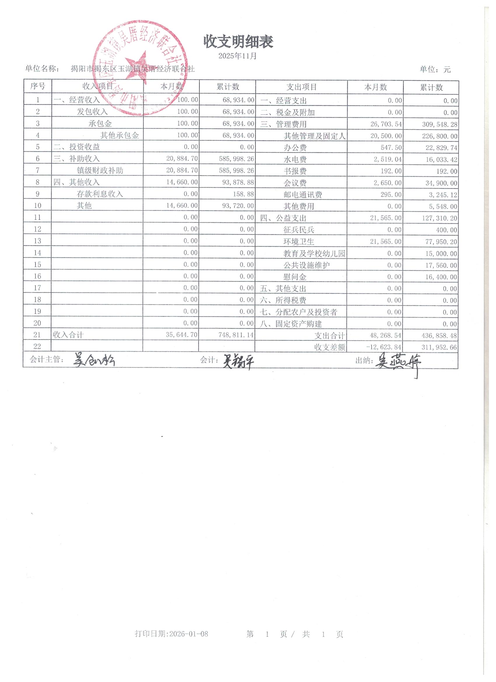 吴厝村2025年11月份收支明细表