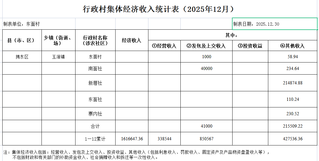 东面村12月份集体经济收入统计表