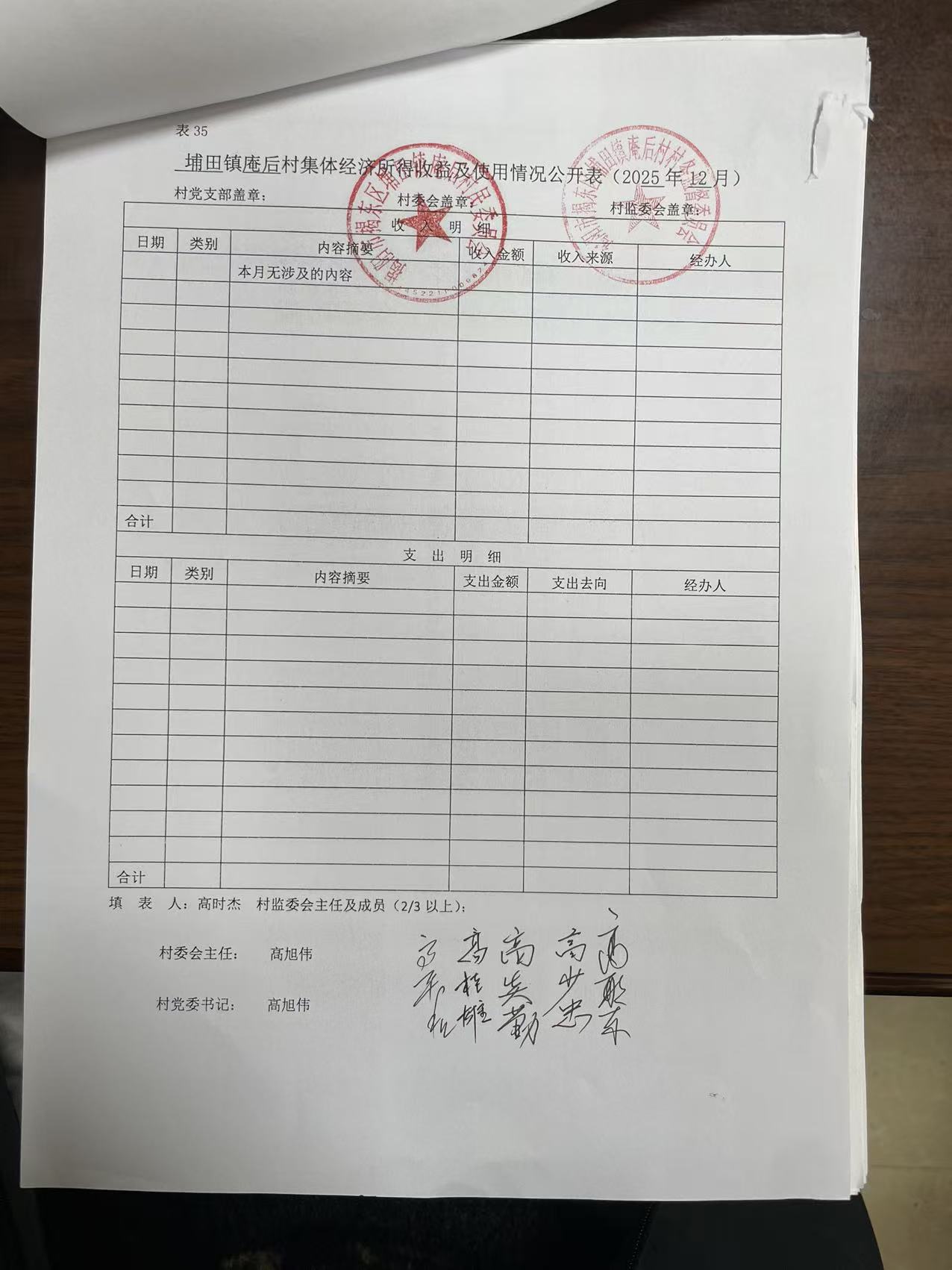埔田镇庵后村集体经济所得收益及使用情况公开表(2025年12月)