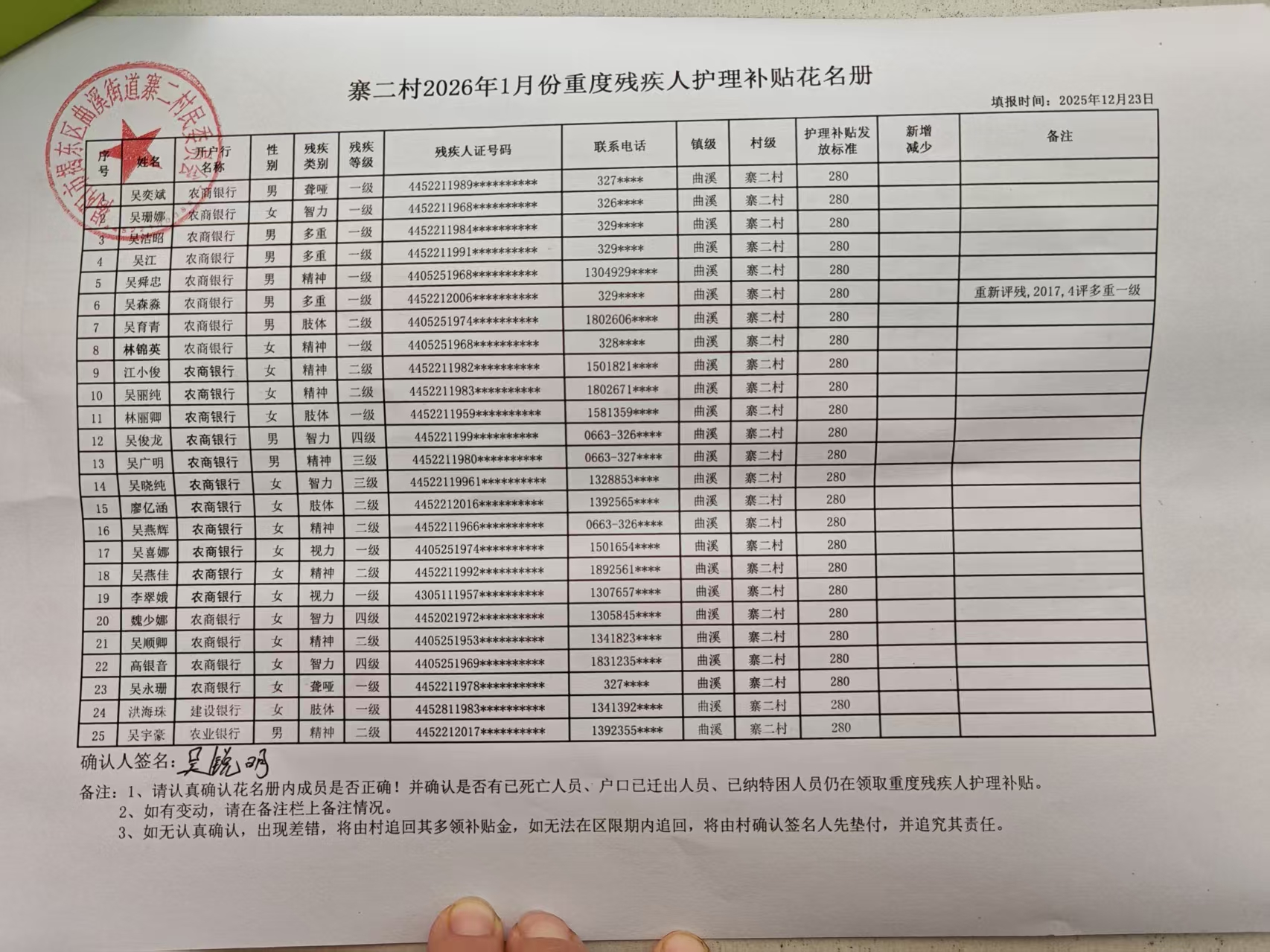 寨二村2026年1月份重度残疾人护理补贴花名册
