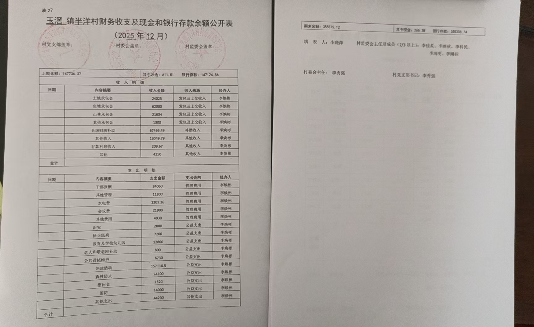 2025年12月玉滘镇半洋村财务收支及现金和银行存款余额公开表